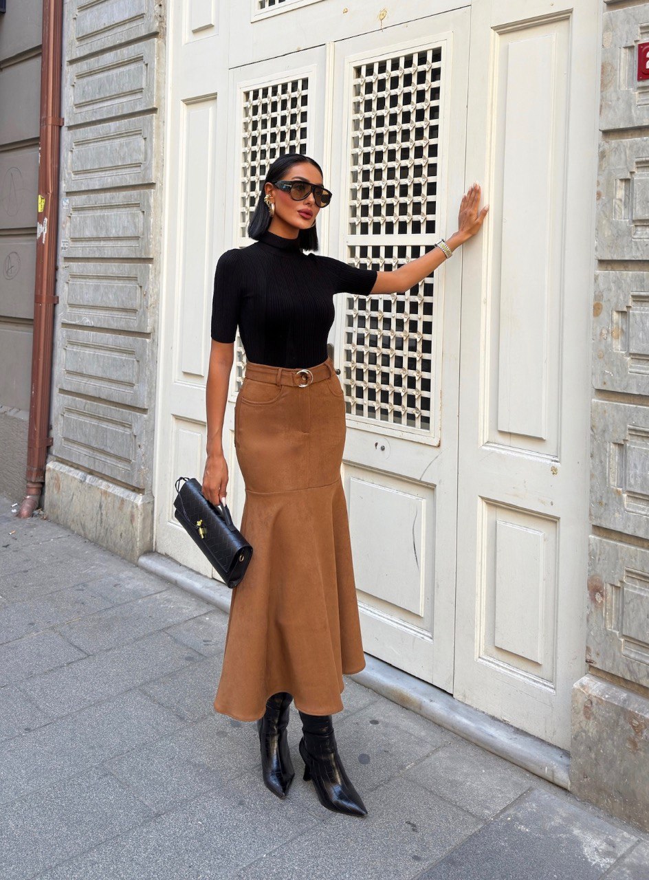 Elegant and timeless — this camel-colored midi skirt in a faux suede look is the perfect blend of sophistication and comfort. Crafted from a soft polyester and elastane blend, it offers a flattering fit that hugs your curves while allowing effortless movement.