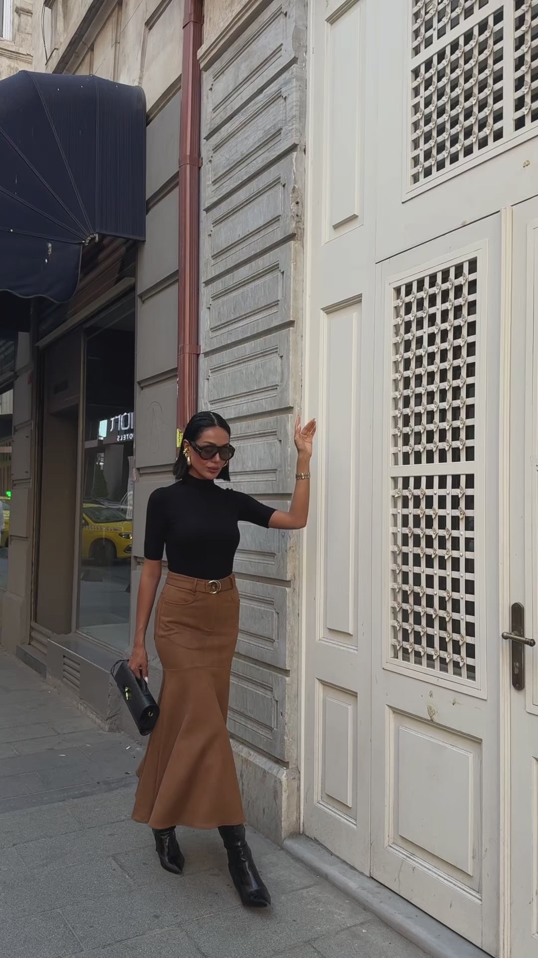 Designed with a high waist and a subtle flared hem, this piece adds a touch of vintage charm to any outfit. Pair it with a fitted top and boots for a chic everyday or evening look.