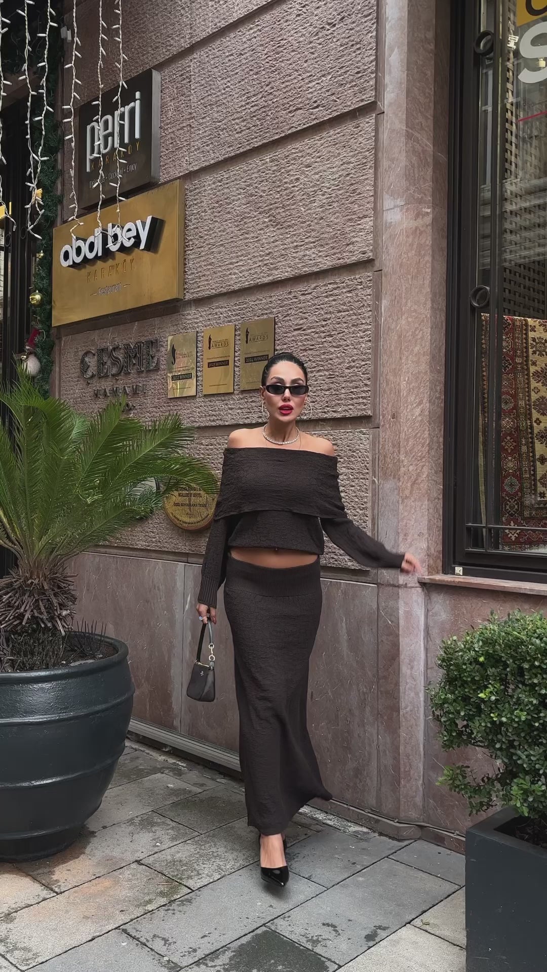 Pulover z odkritimi rameni ima laskav pregibni izrez, ki lepo poudari ključnice, medtem ko oprijeti dolgi rokavi ustvarjajo uravnoteženo, elegantno obliko. Ujemajoče se visokopasovno maksi krilo se nežno oprime telesa in elegantno pada z vsakim korakom, kar ustvarja dolg, podolgovat videz.