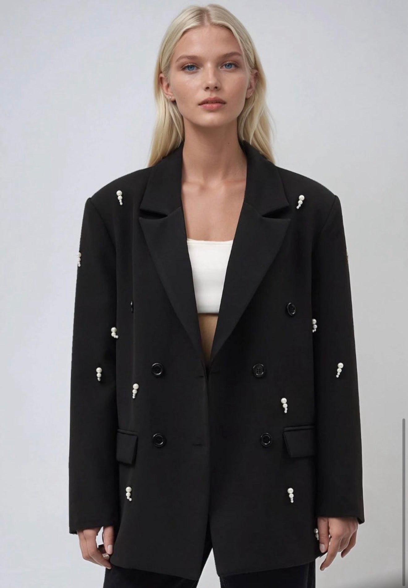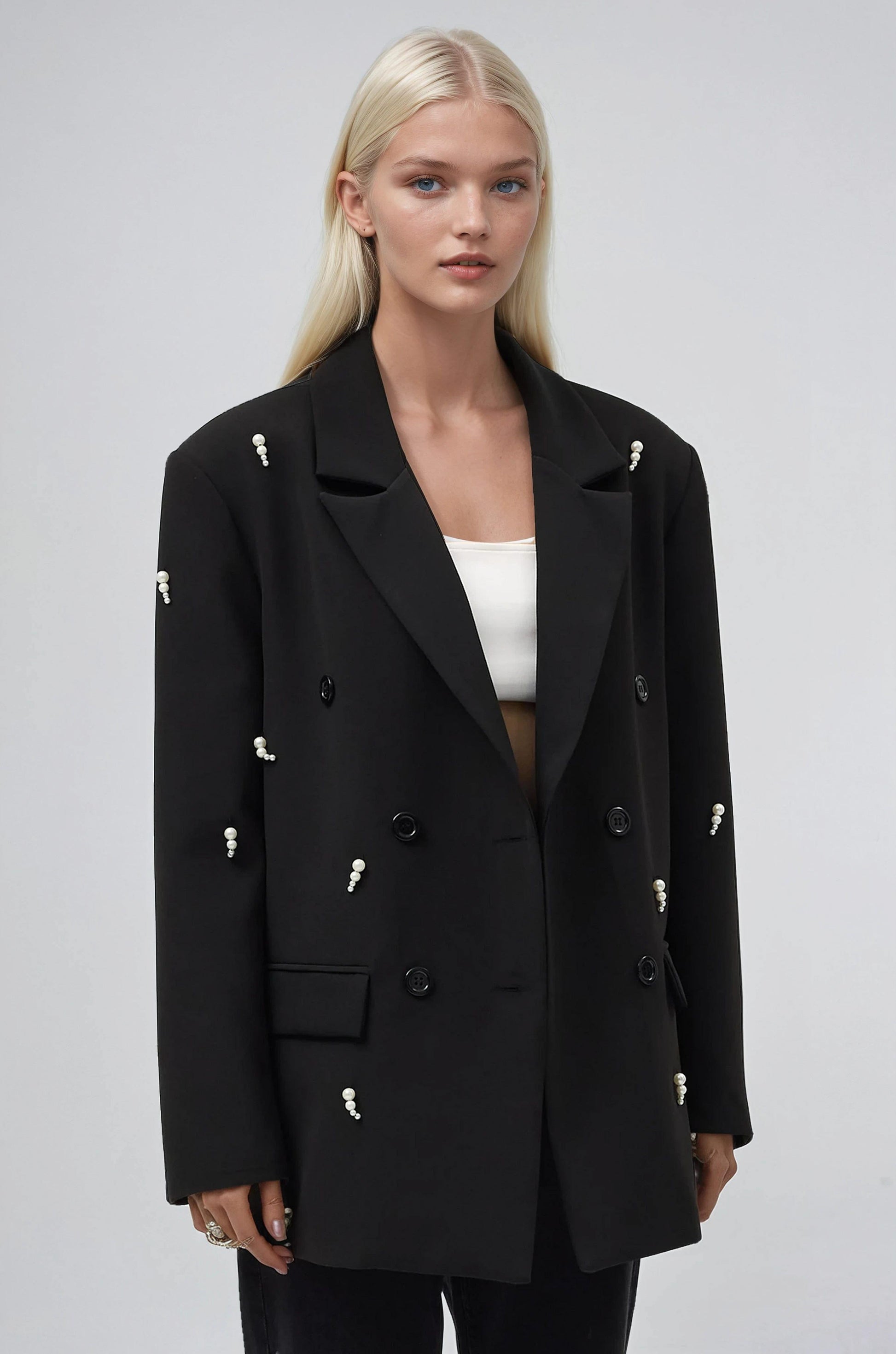 Zasnovana z ostro silhueto in strukturiranimi rameni ustvarja samozavestno in laskavo postavo. Dvoredni kroj doda brezčasen krojaški videz, raztreseni biserni detajli pa ustvarjajo mehak, ženstven kontrast s čisto črno osnovo. Žepi z zavihki in klasičen ovratnik z reverjem dopolnjujejo eleganten dizajn.