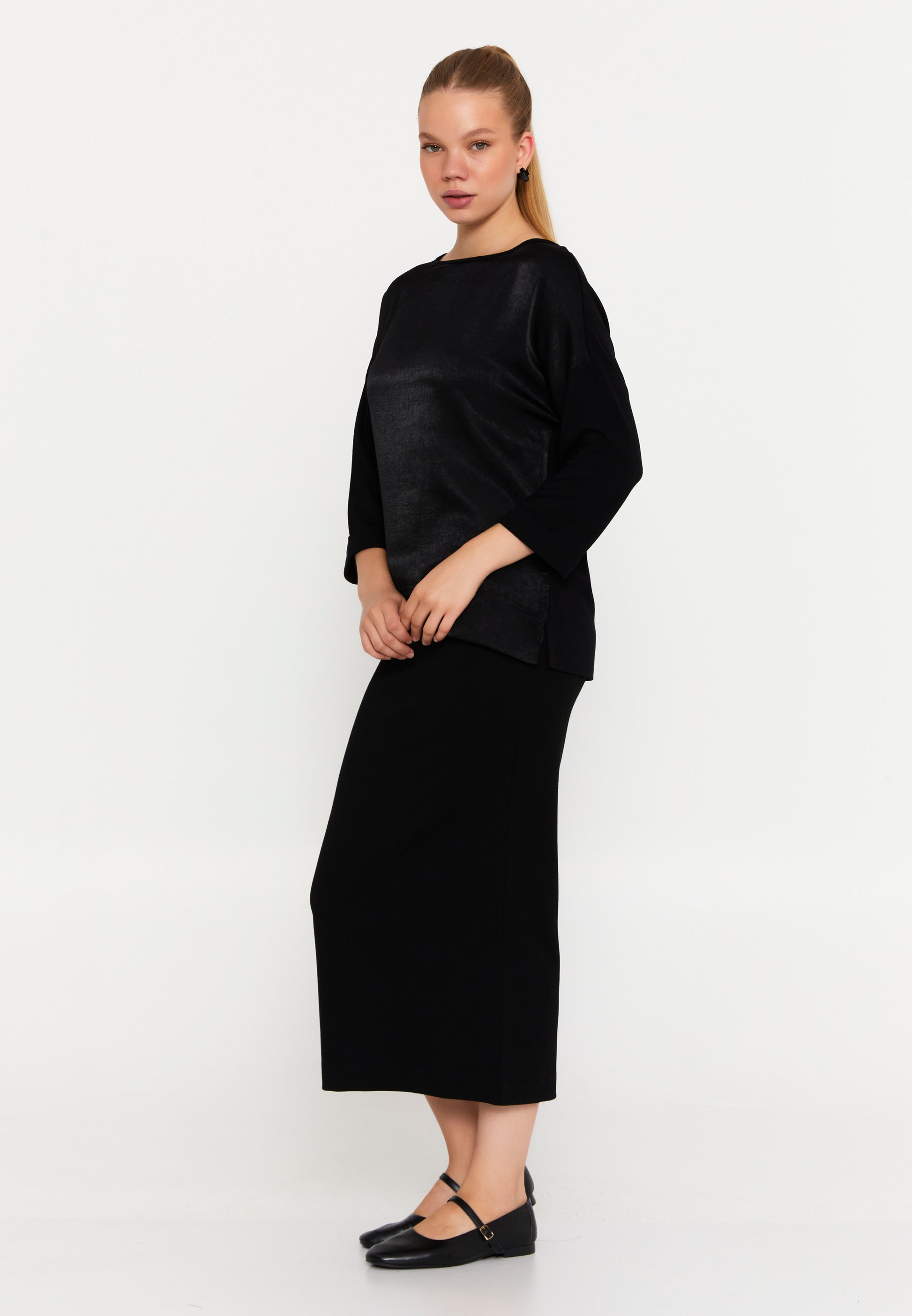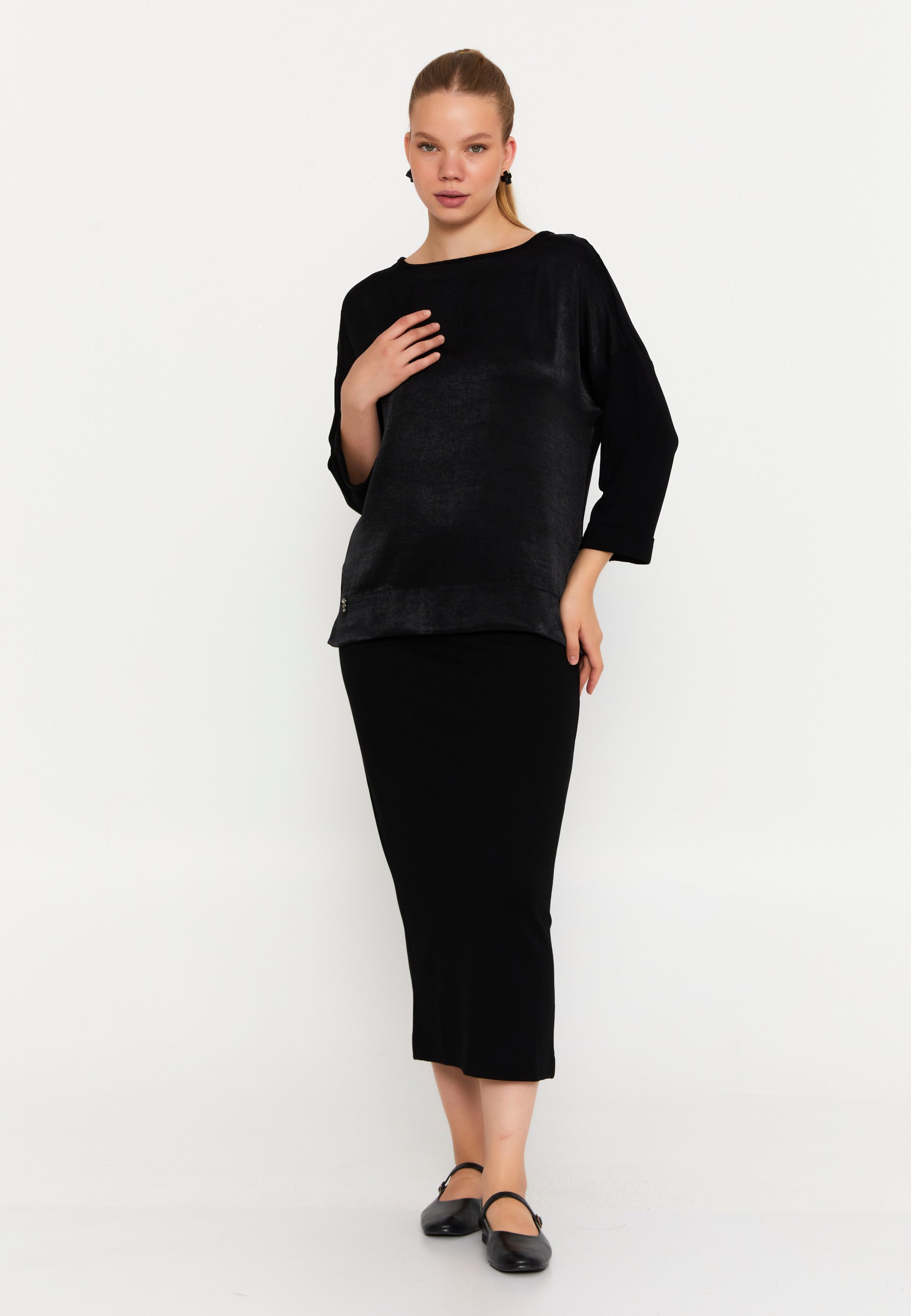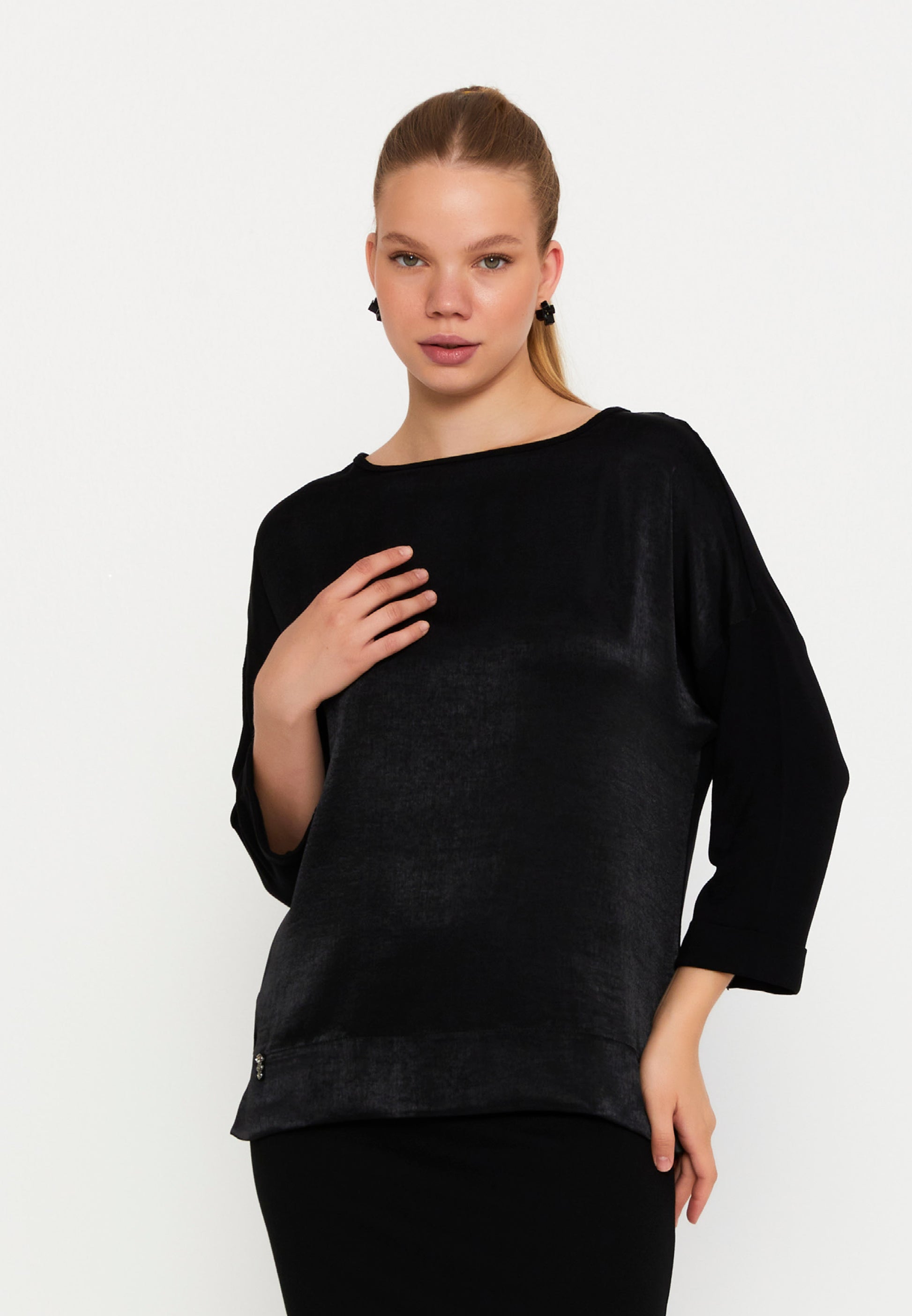 Izstopajte s to elegantno črno bluzo, zasnovano za sodobno žensko, ki išče ravnovesje med preprostostjo in prefinjenostjo. Sproščen kroj zgornjega dela dopolnjuje nežen lesk na sprednjem delu, ki poudarja njegov minimalističen dizajn. Ta bluza, izdelana iz mešanice viskoze, poliestra in elastana, ponuja udobje in raztegljivost, kar zagotavlja laskavo in prilagodljivo prileganje. S svojim vsestranskim slogom se brezhibno preliva iz dnevnega v večerni.