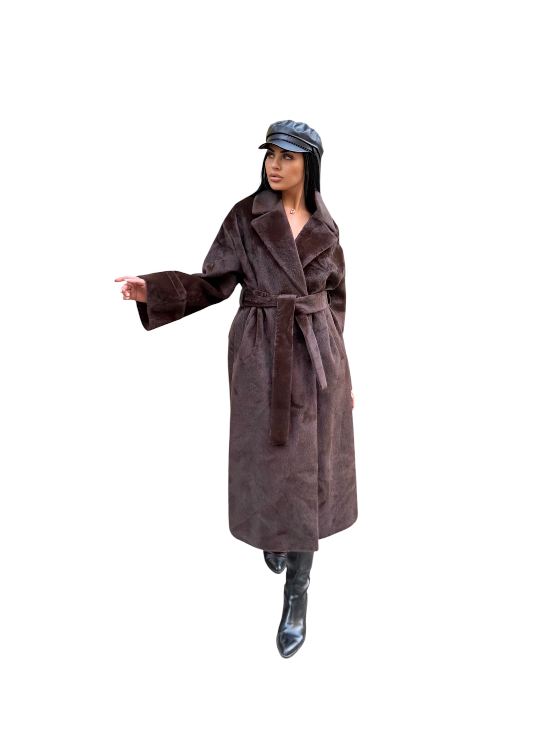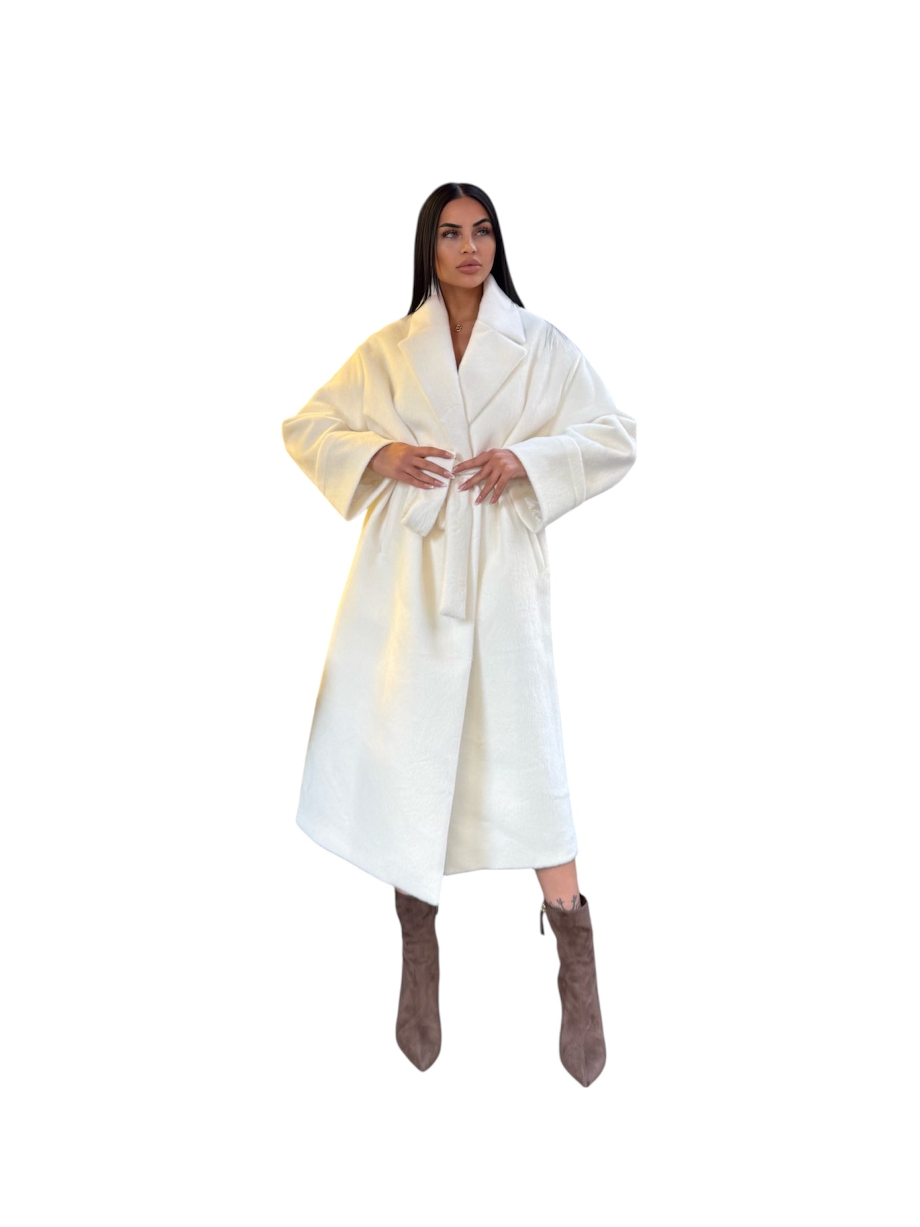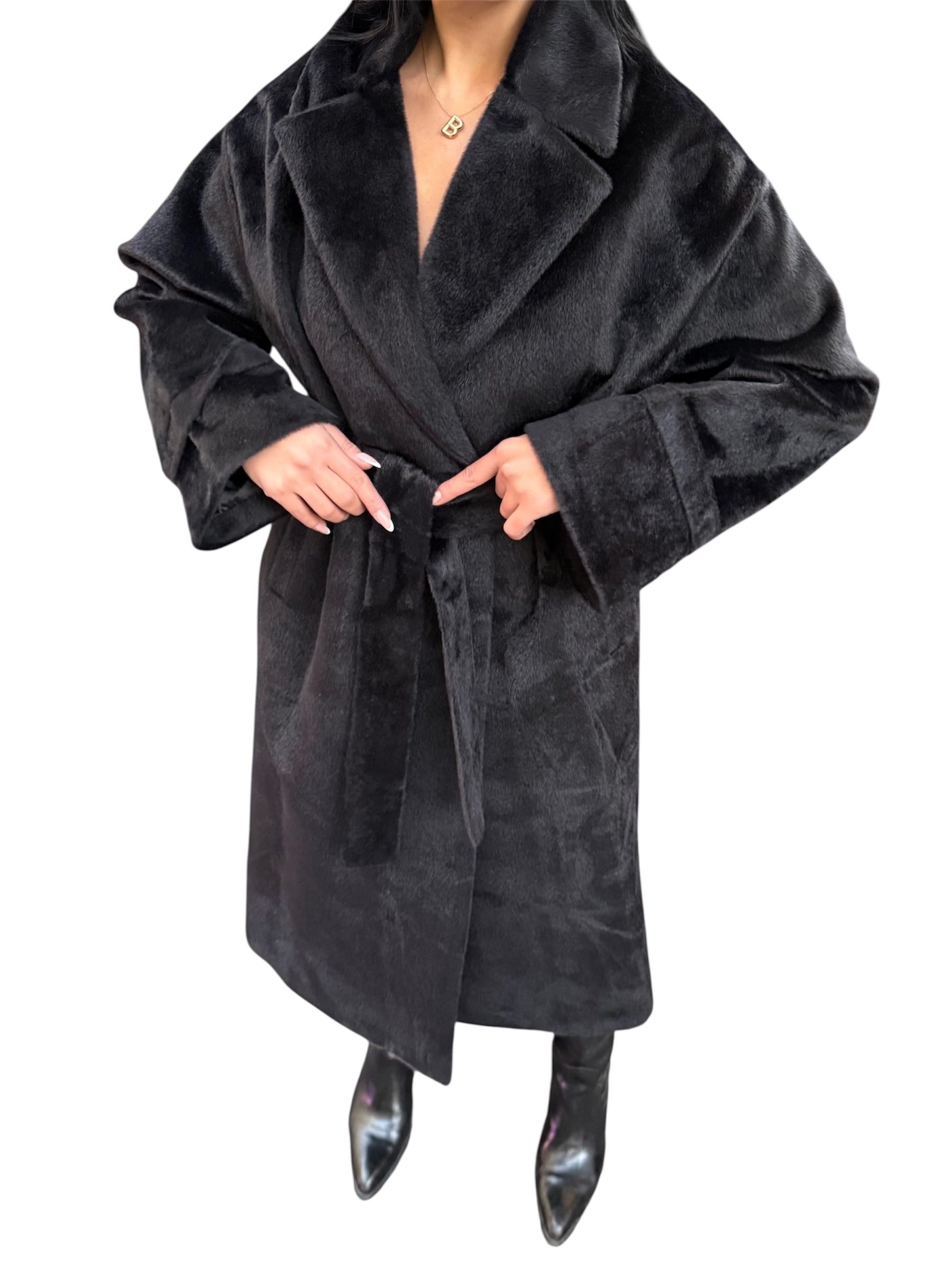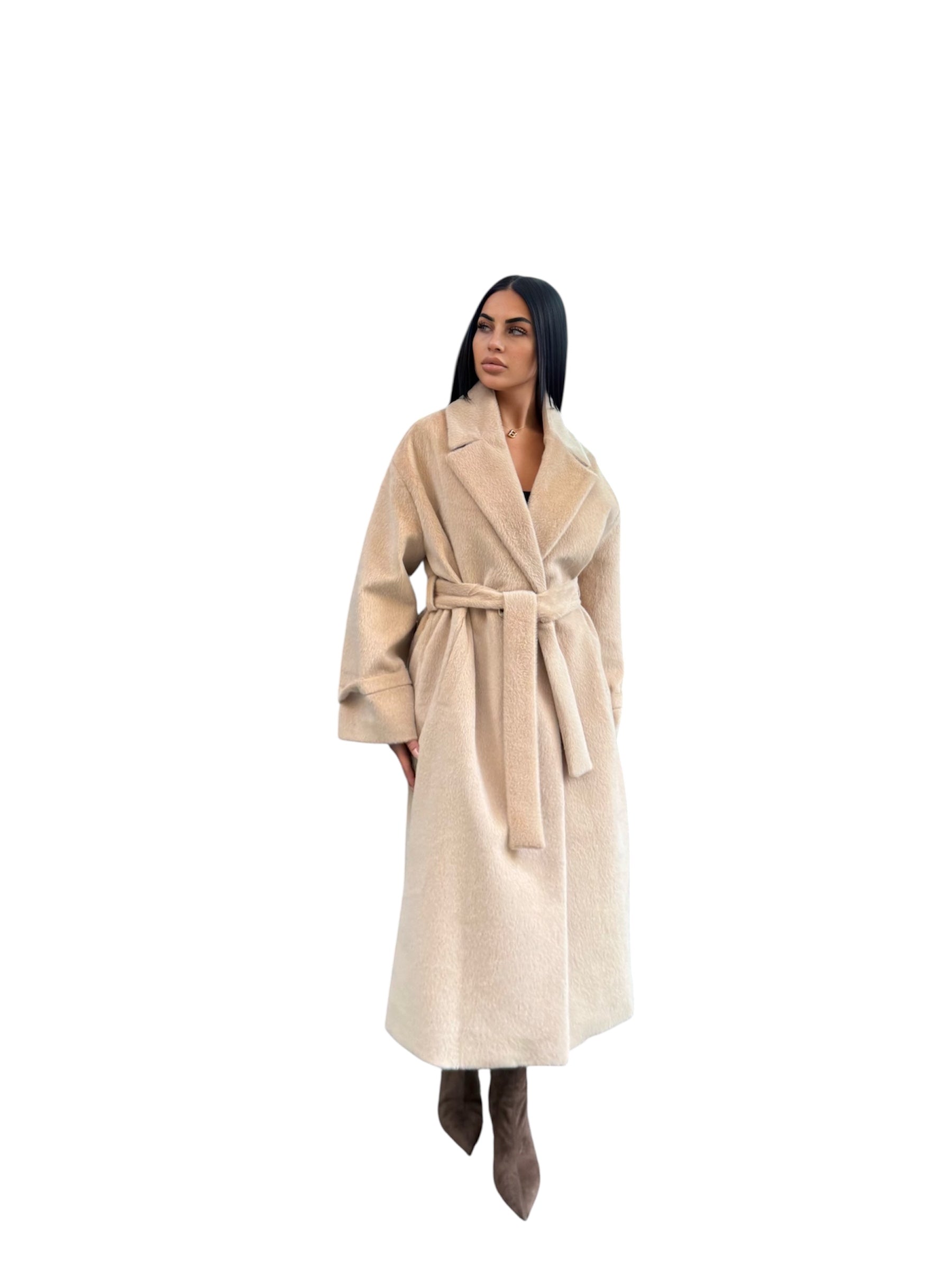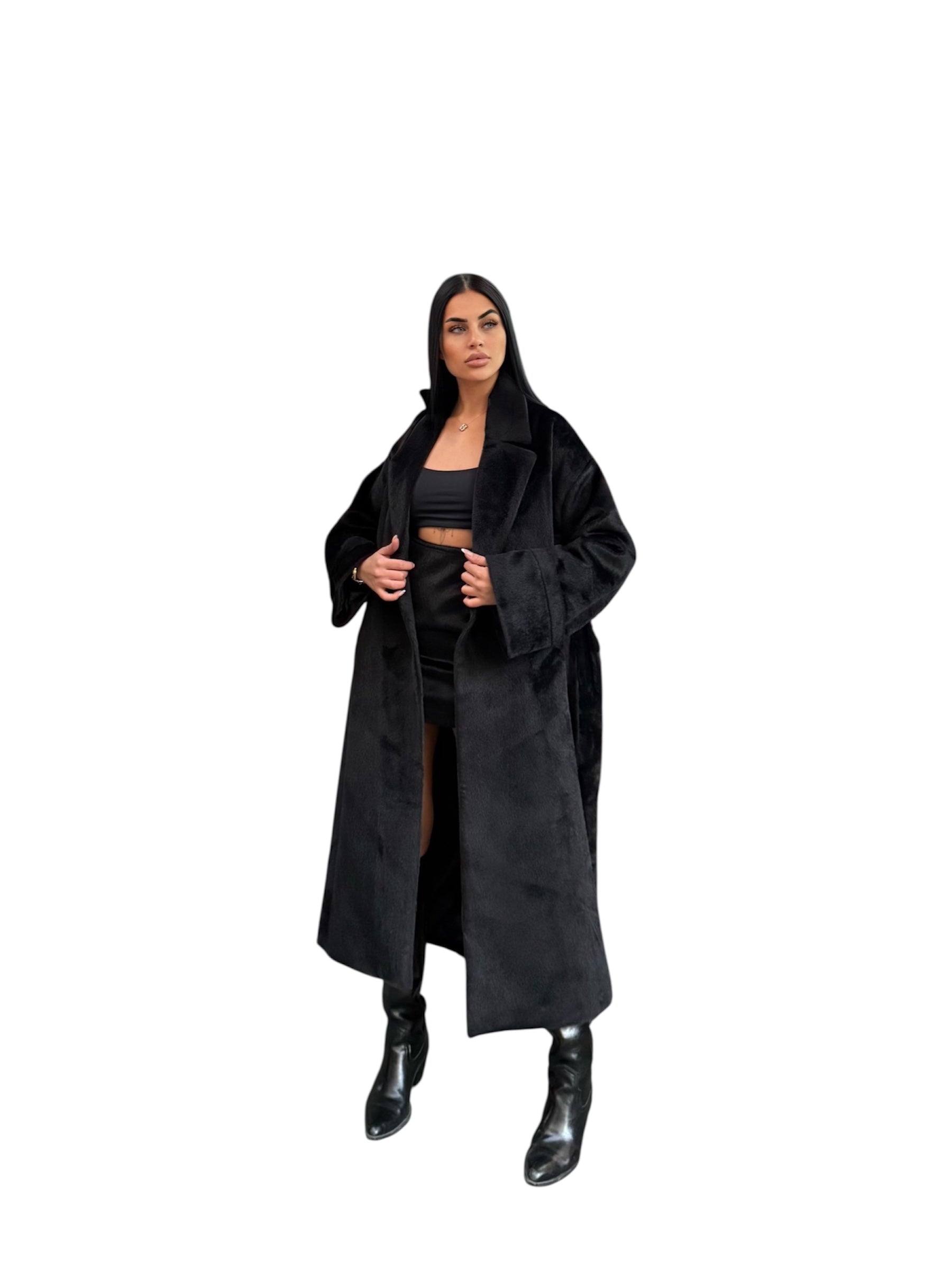 Z veliko silhueto, širokimi reverji in pasom, ki poudarja pas, ta plašč ustvarja čudovito strukturiran, a sproščen videz. Dolga dolžina doda dramatičnost in prefinjenost, mehka, plišasta tekstura pa polepša vsako obleko. Nosite ga odprtega za sodoben, sproščen pridih ali pa ga zavežite okoli pasu za elegantno, ženstveno silhueto.