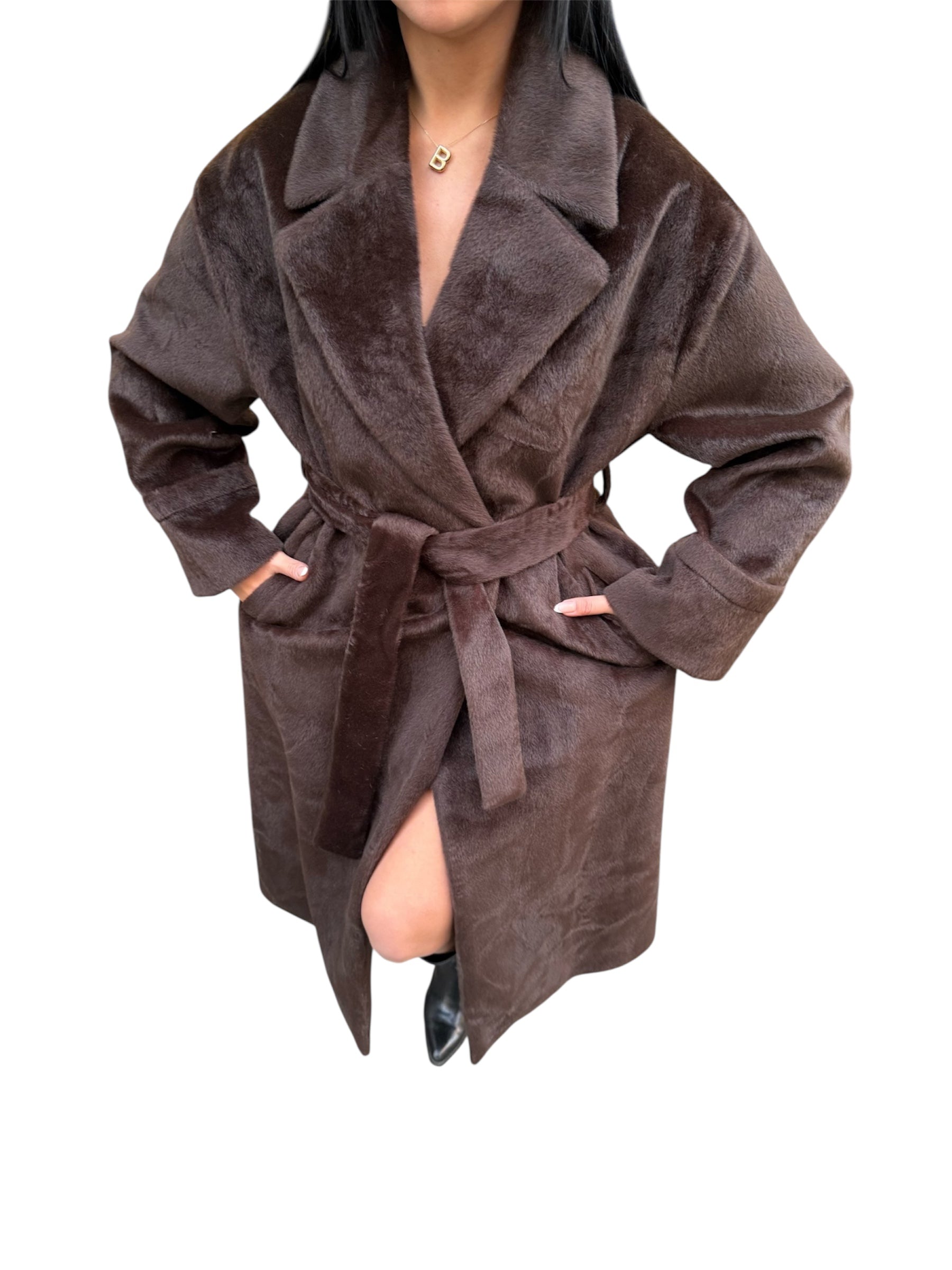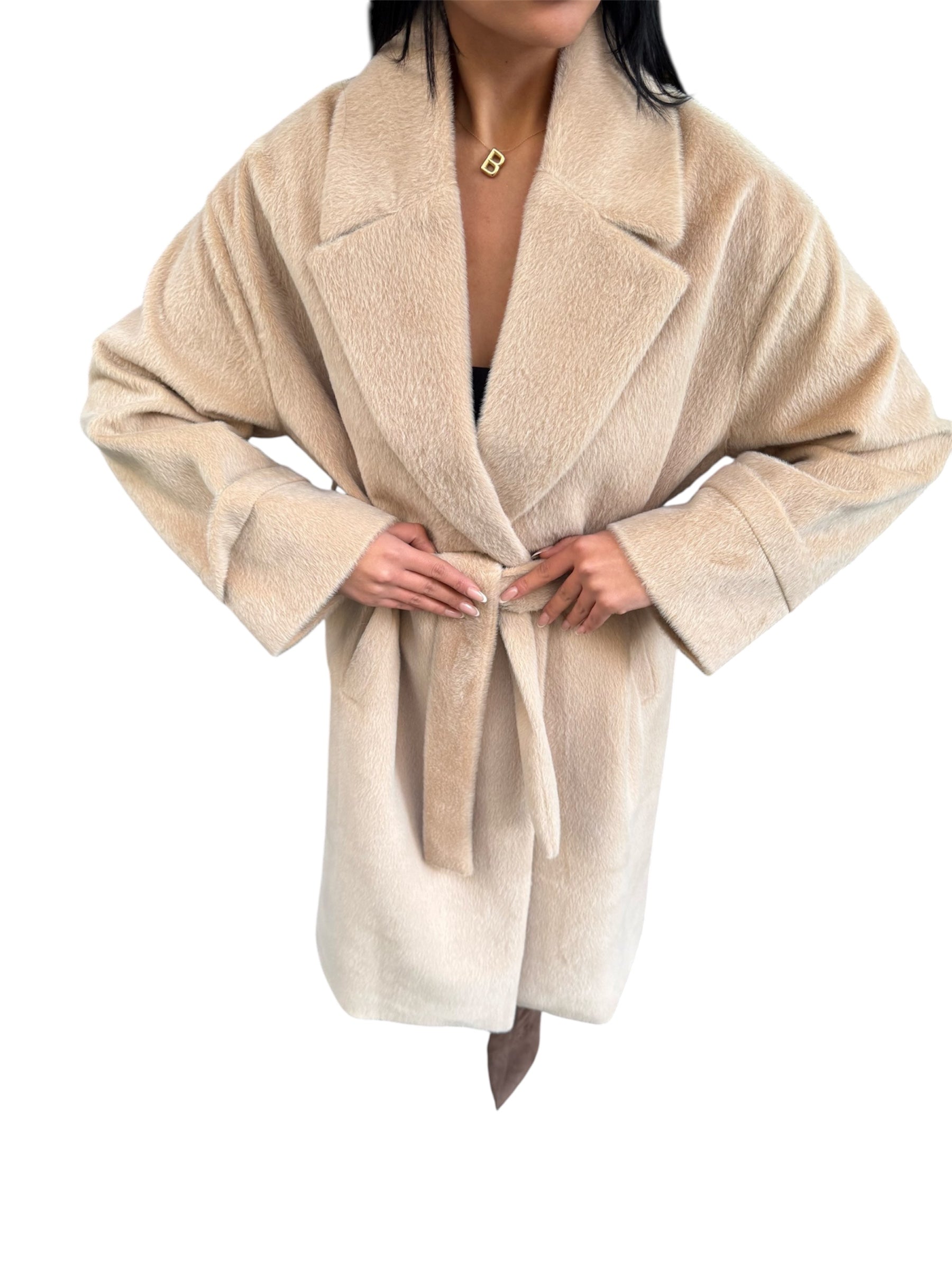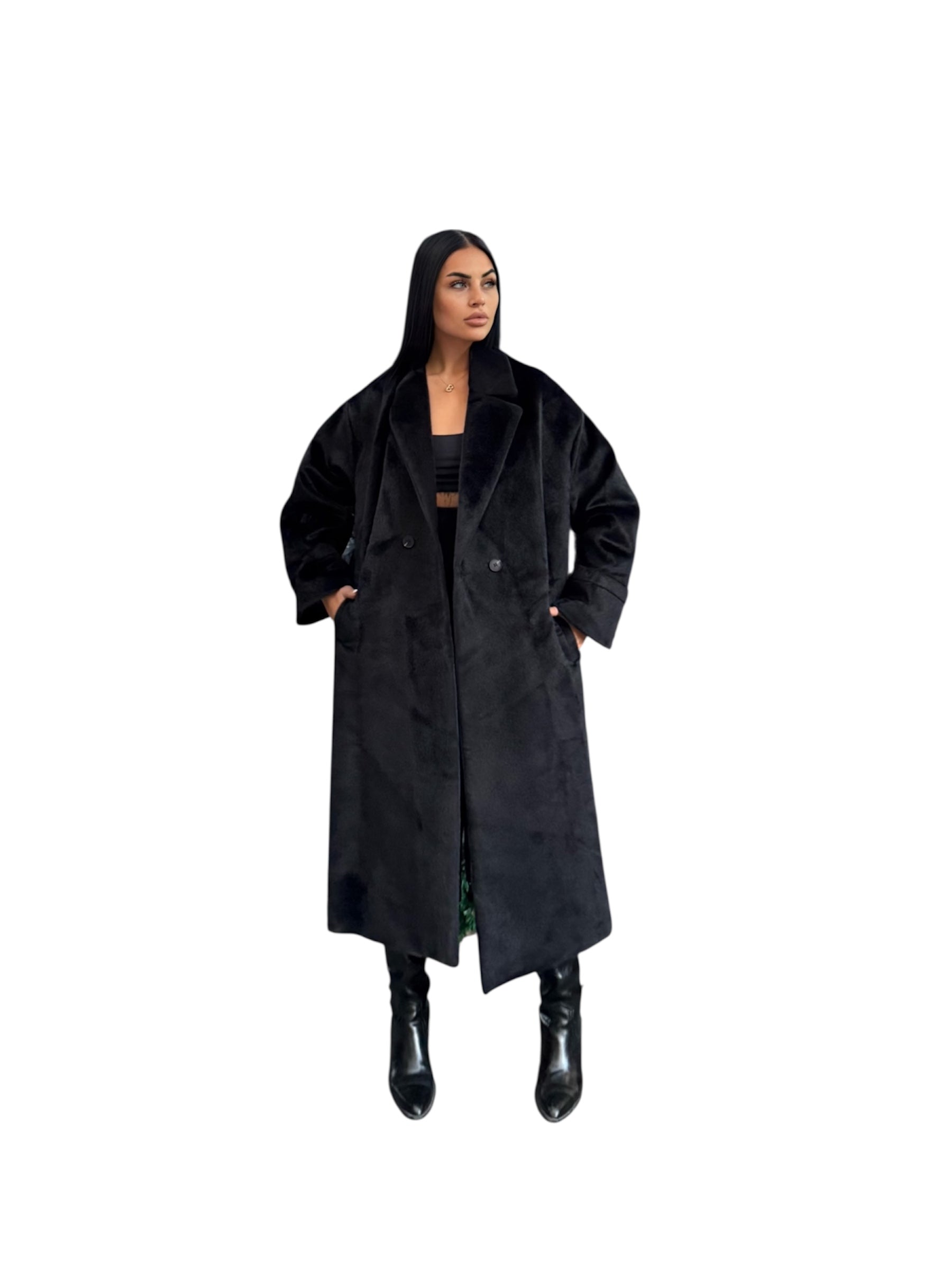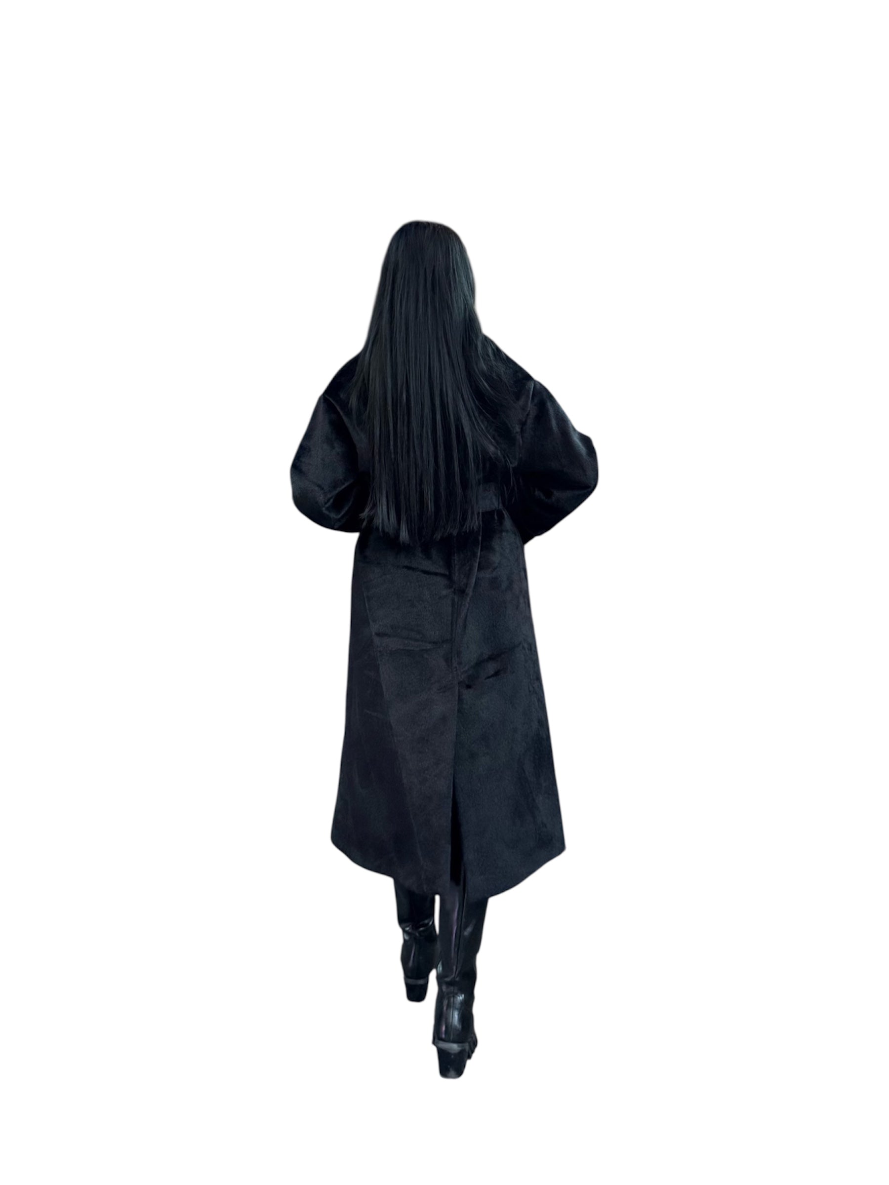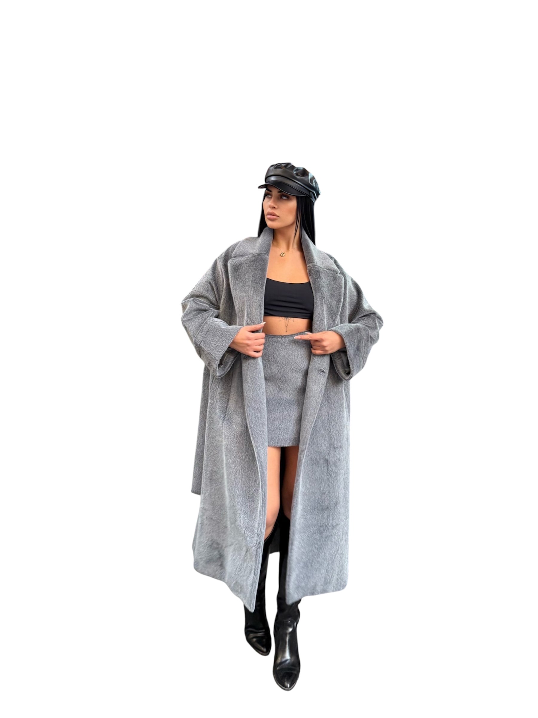 Z veliko silhueto, širokimi reverji in pasom, ki poudarja pas, ta plašč ustvarja čudovito strukturiran, a sproščen videz. Dolga dolžina doda dramatičnost in prefinjenost, mehka, plišasta tekstura pa polepša vsako obleko. Nosite ga odprtega za sodoben, sproščen pridih ali pa ga zavežite okoli pasu za elegantno, ženstveno silhueto.