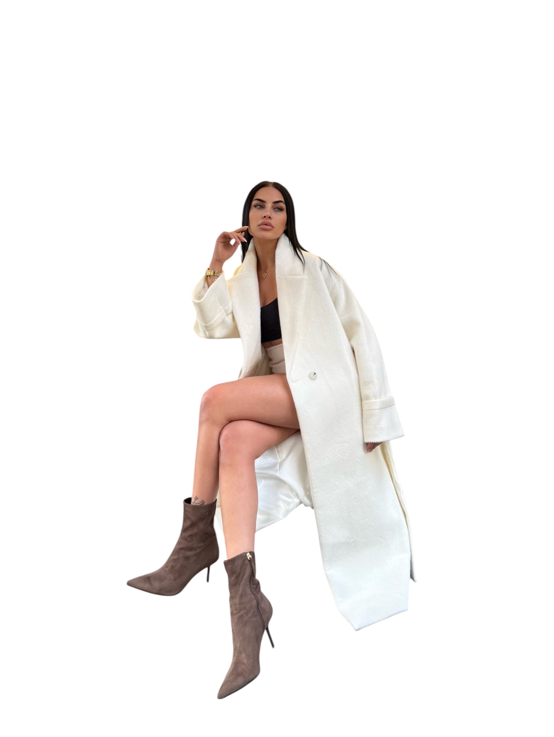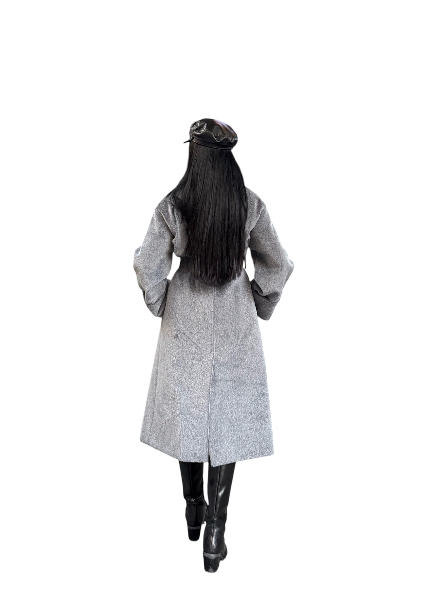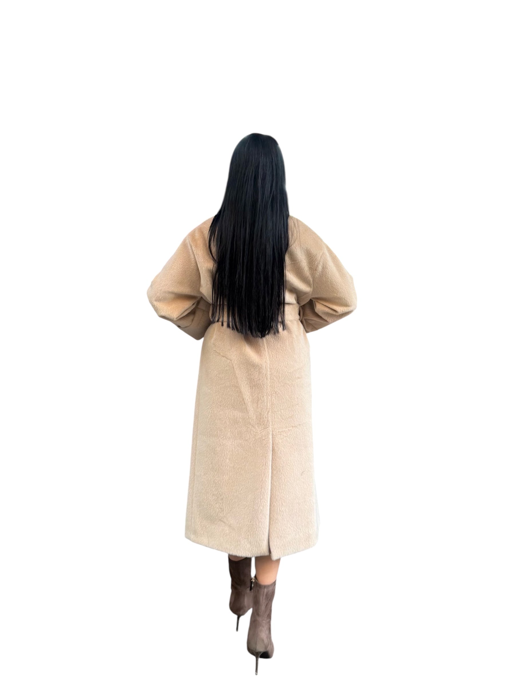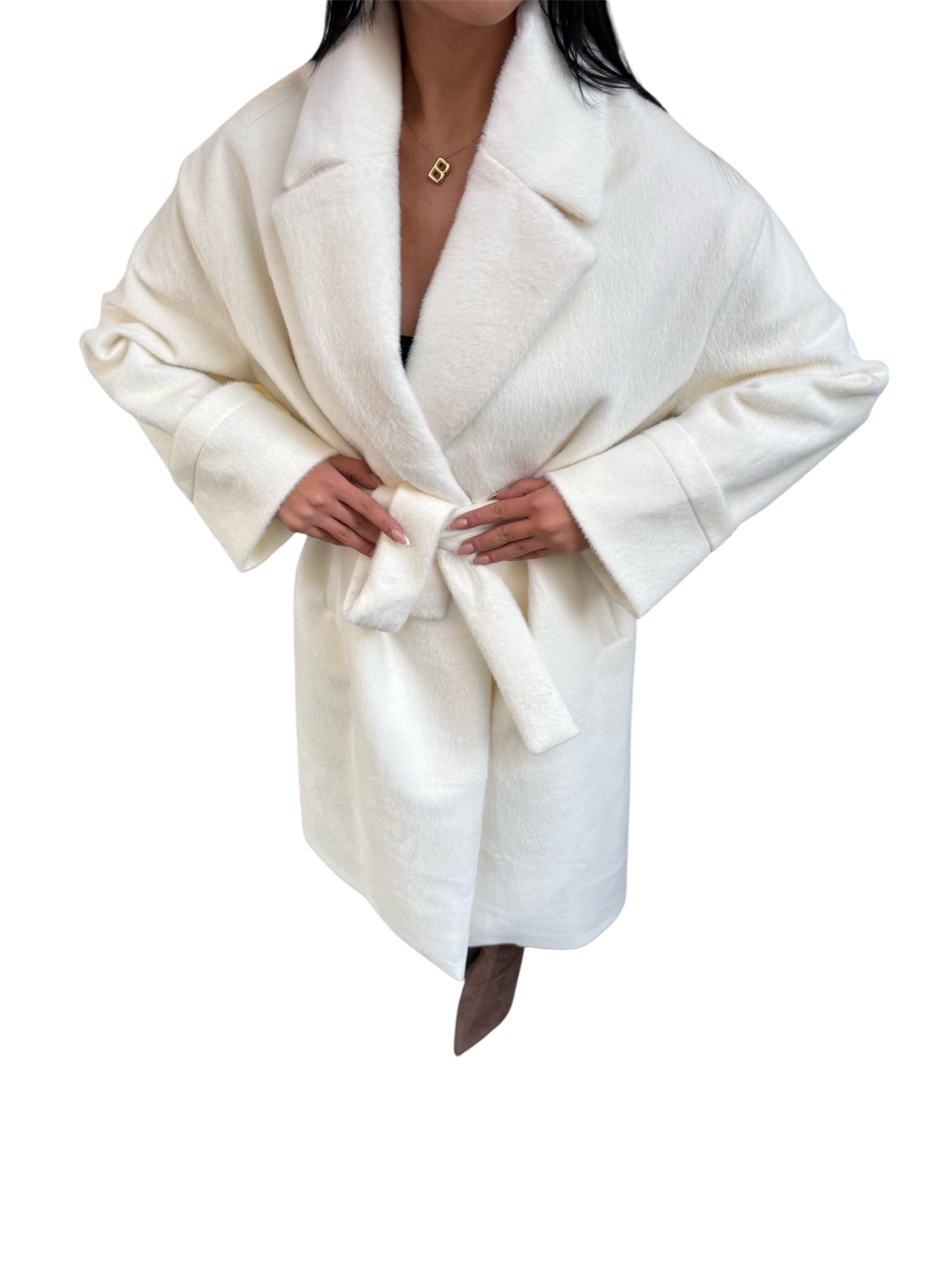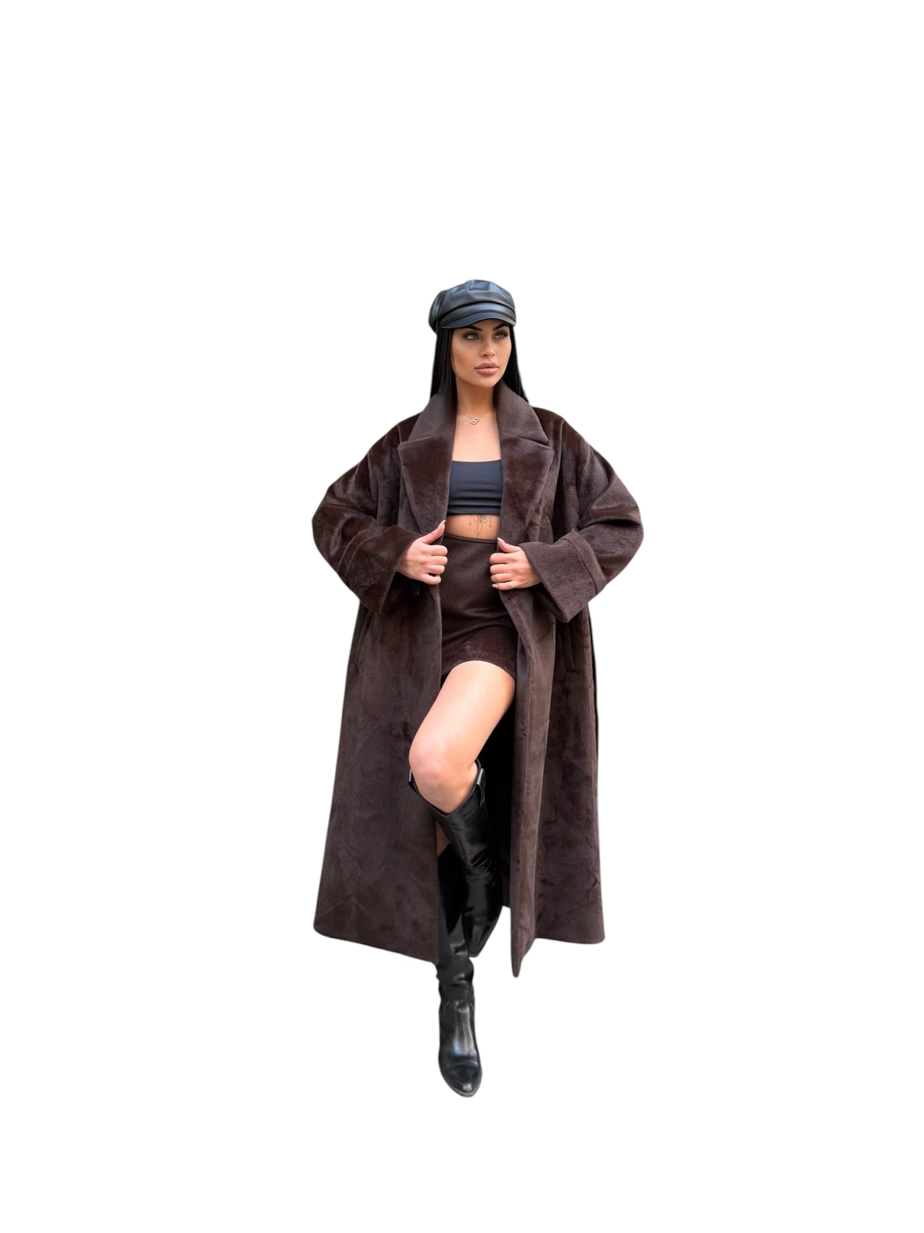 Z veliko silhueto, širokimi reverji in pasom, ki poudarja pas, ta plašč ustvarja čudovito strukturiran, a sproščen videz. Dolga dolžina doda dramatičnost in prefinjenost, mehka, plišasta tekstura pa polepša vsako obleko. Nosite ga odprtega za sodoben, sproščen pridih ali pa ga zavežite okoli pasu za elegantno, ženstveno silhueto.