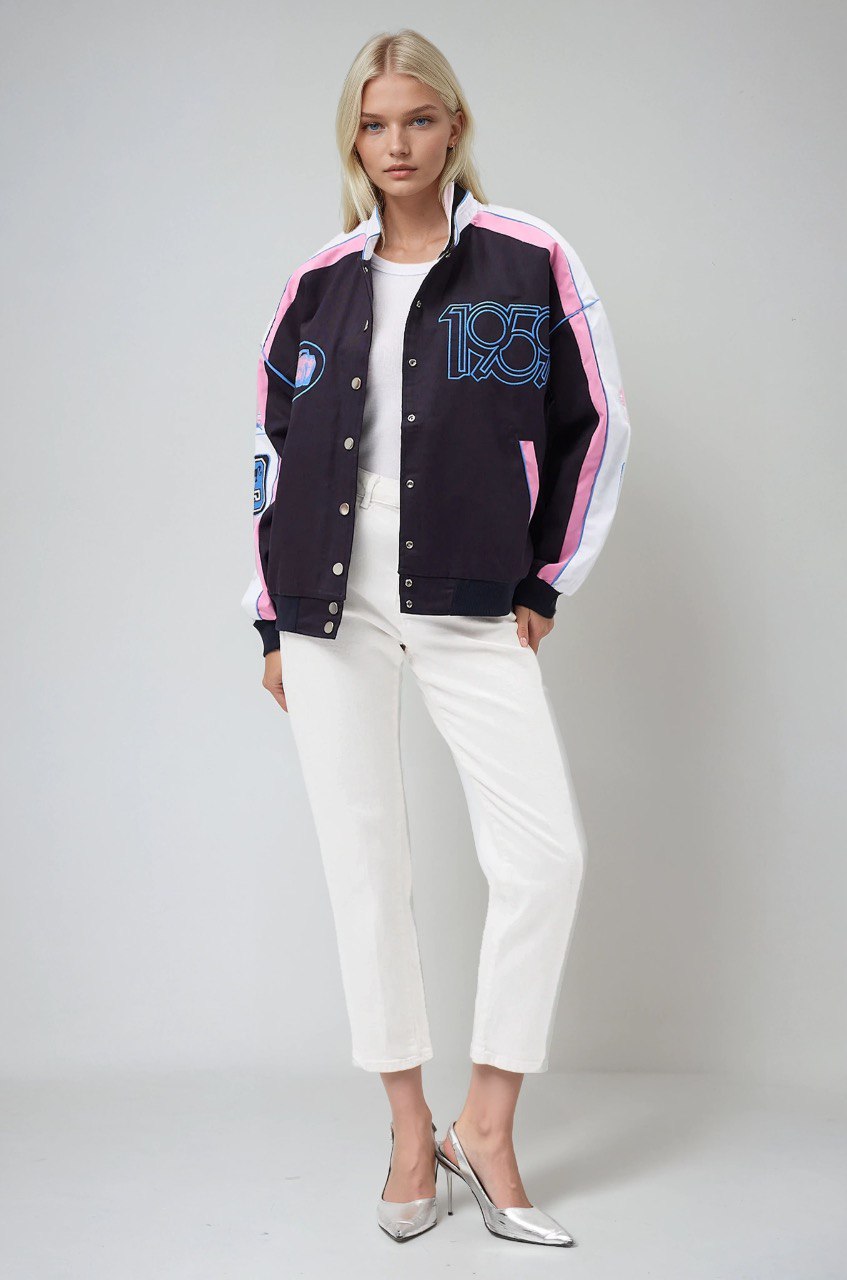 Sproščena silhueta ponuja lahkotno udobje, medtem ko spredaj zapenjanje z gumbi in rebrasti manšeti ohranjajo videz strukturiran in eleganten. Izraziti našitki in vezeni grafični elementi dodajo osebnost, kontrastni paneli na rokavih pa ustvarjajo dinamičen in sodoben videz. Gladka tkanina z dodatno raztegljivostjo zagotavlja prožnost in lahkotnost gibanja.