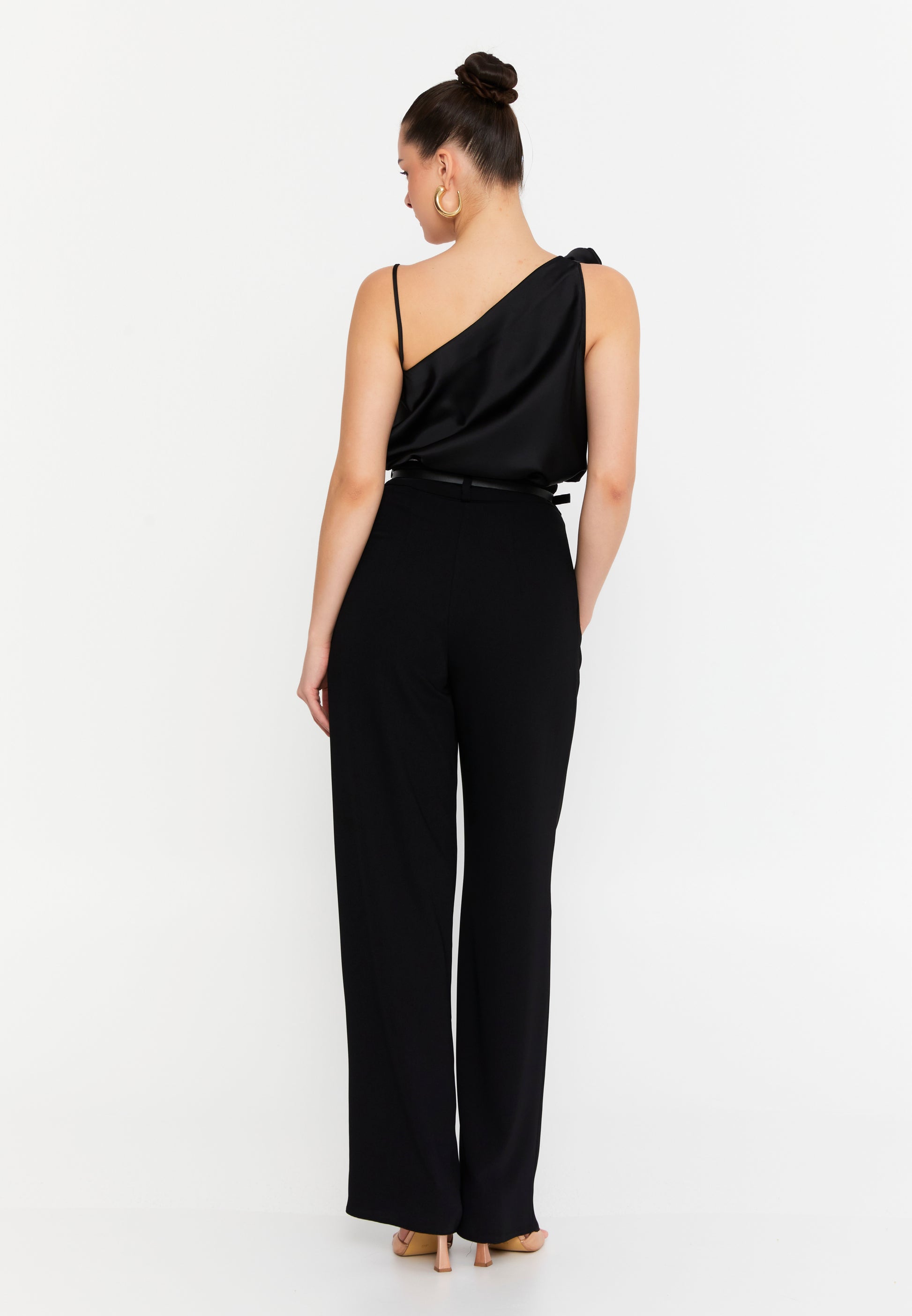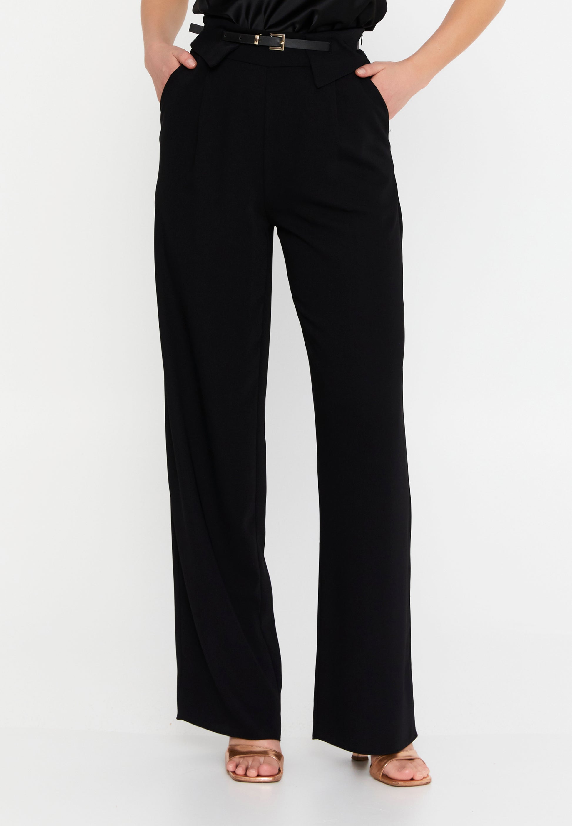 S temi elegantnimi črnimi hlačami, zasnovanimi za moderno žensko, ki išče eleganco s sodobnim pridihom, pokažite svoj stil. Visok pas je dopolnjen z detajlom pasu, ki poudarja silhueto, širok kroj pa ponuja prefinjenost in udobje. Hlače, izdelane iz gladke mešanice poliestra, zagotavljajo prožnost in eleganten videz, zaradi česar so popolne tako za pisarniško nošenje kot za večerne priložnosti.