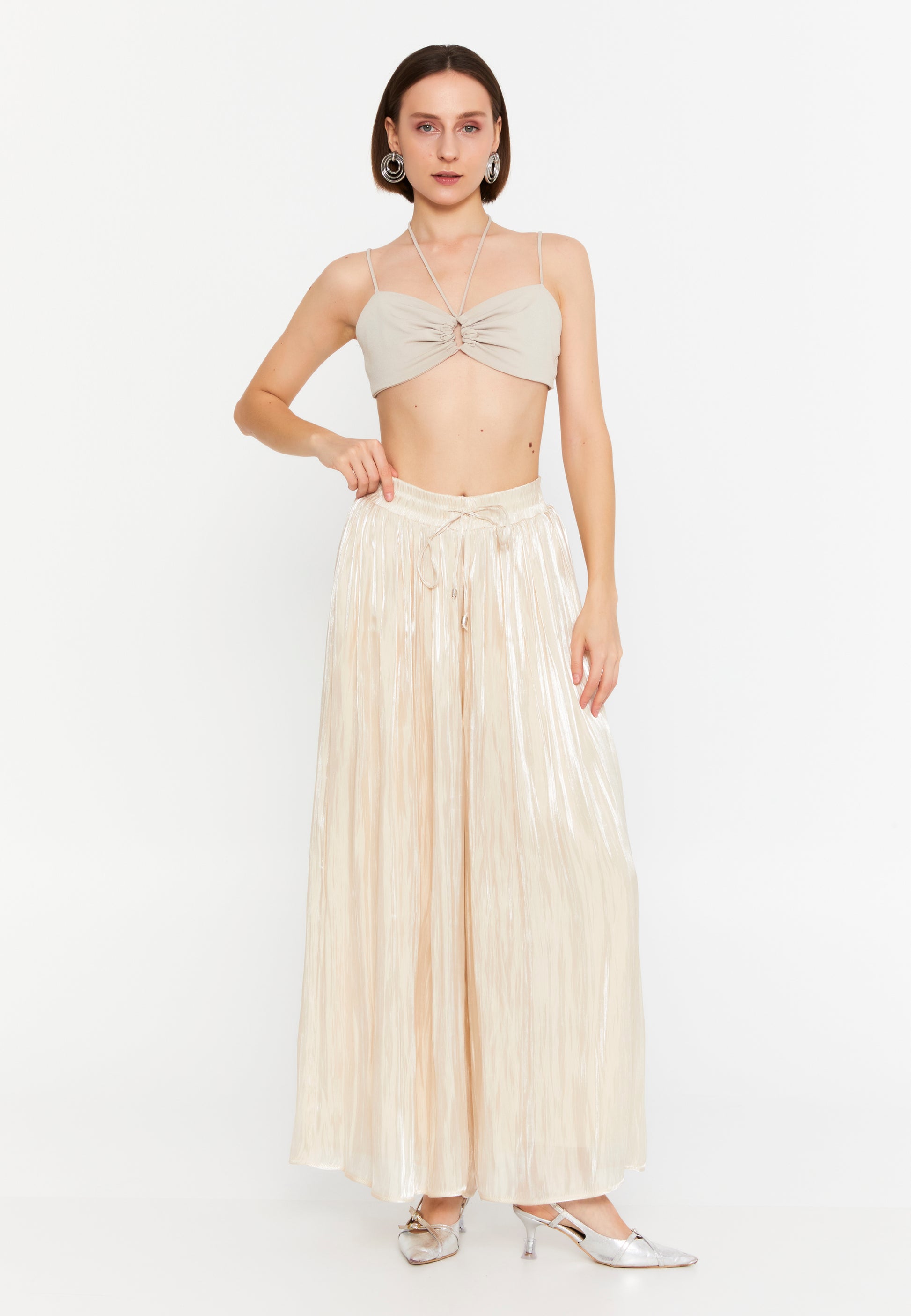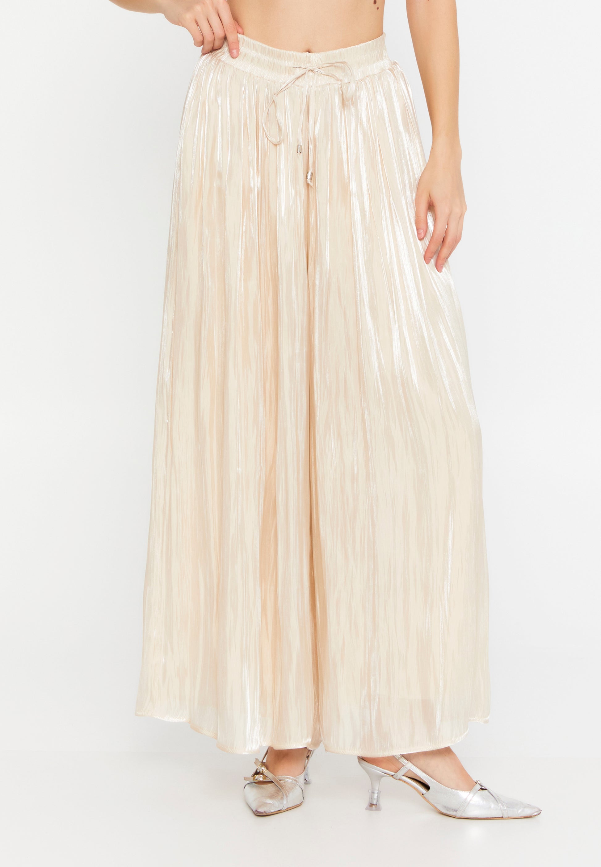 Pritegnite poglede s temi lahkotno elegantnimi širokimi hlačami, zasnovanimi za žensko, ki z lahkoto sprejema sodoben glamur. Izdelane iz visokokakovostnega poliestra, imajo te hlače mehak lesketajoč se zaključek in padajočo silhueto, ki ponuja tako udobje kot prefinjeno gibanje. Elastičen pas z vrvico za zategovanje zagotavlja popolno prileganje, nagubana tekstura pa doda globino in prefinjenost. Te hlače so idealne tako za prehod iz dnevnega v večerni outfit kot za posebne priložnosti, saj so vsestranski kos oblačila.