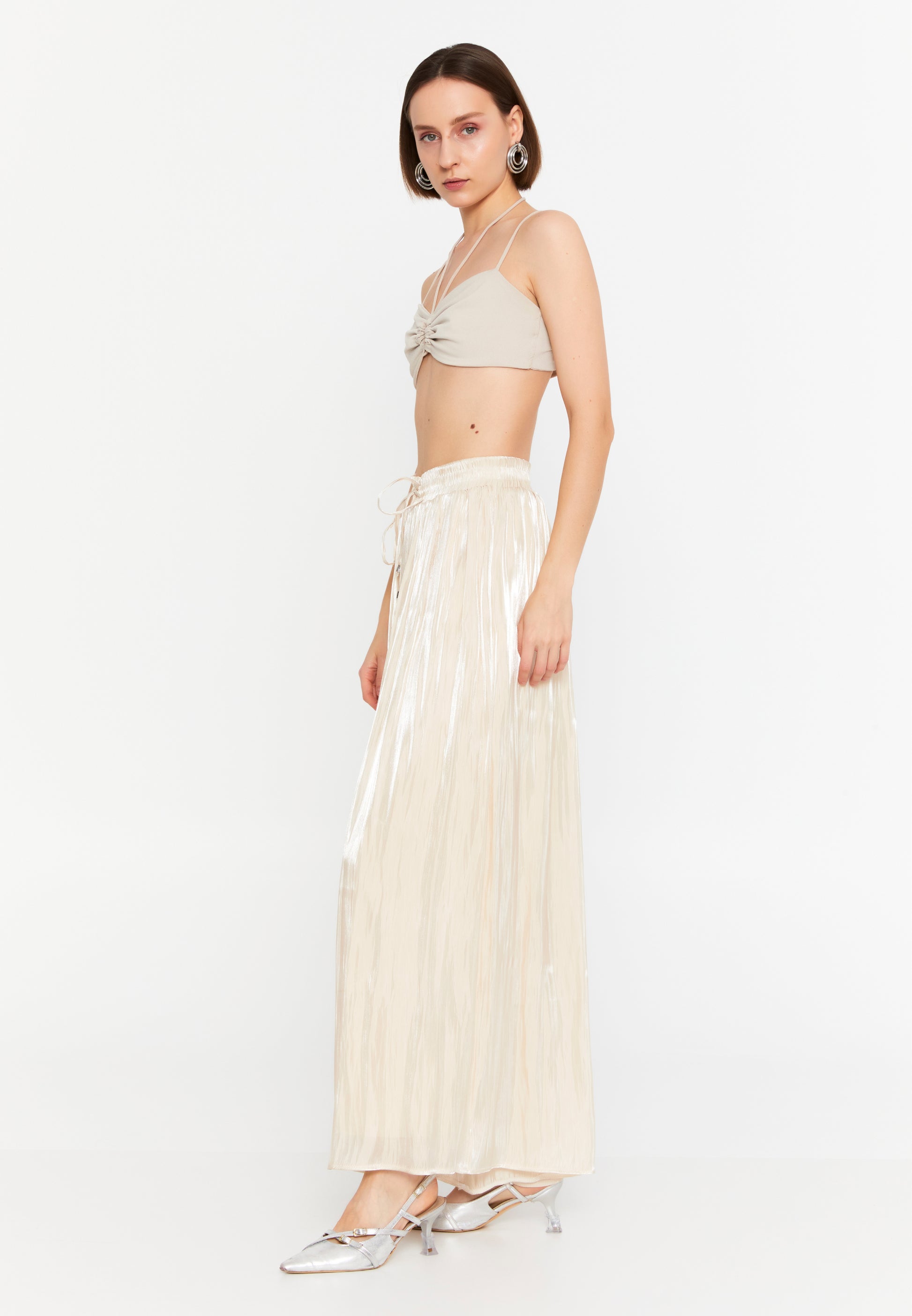 Nasvet za stil: Za eleganten večerni ansambel ga kombinirajte z oprijetim kratkim topom in kovinskimi petami ali pa ga za dnevno eleganco poenostavite z zatlačeno bluzo in sandali.