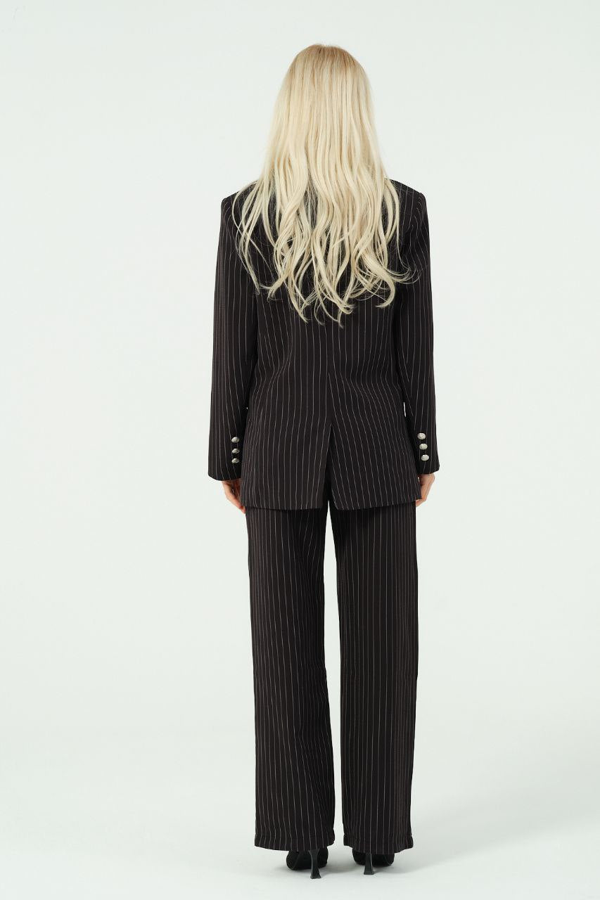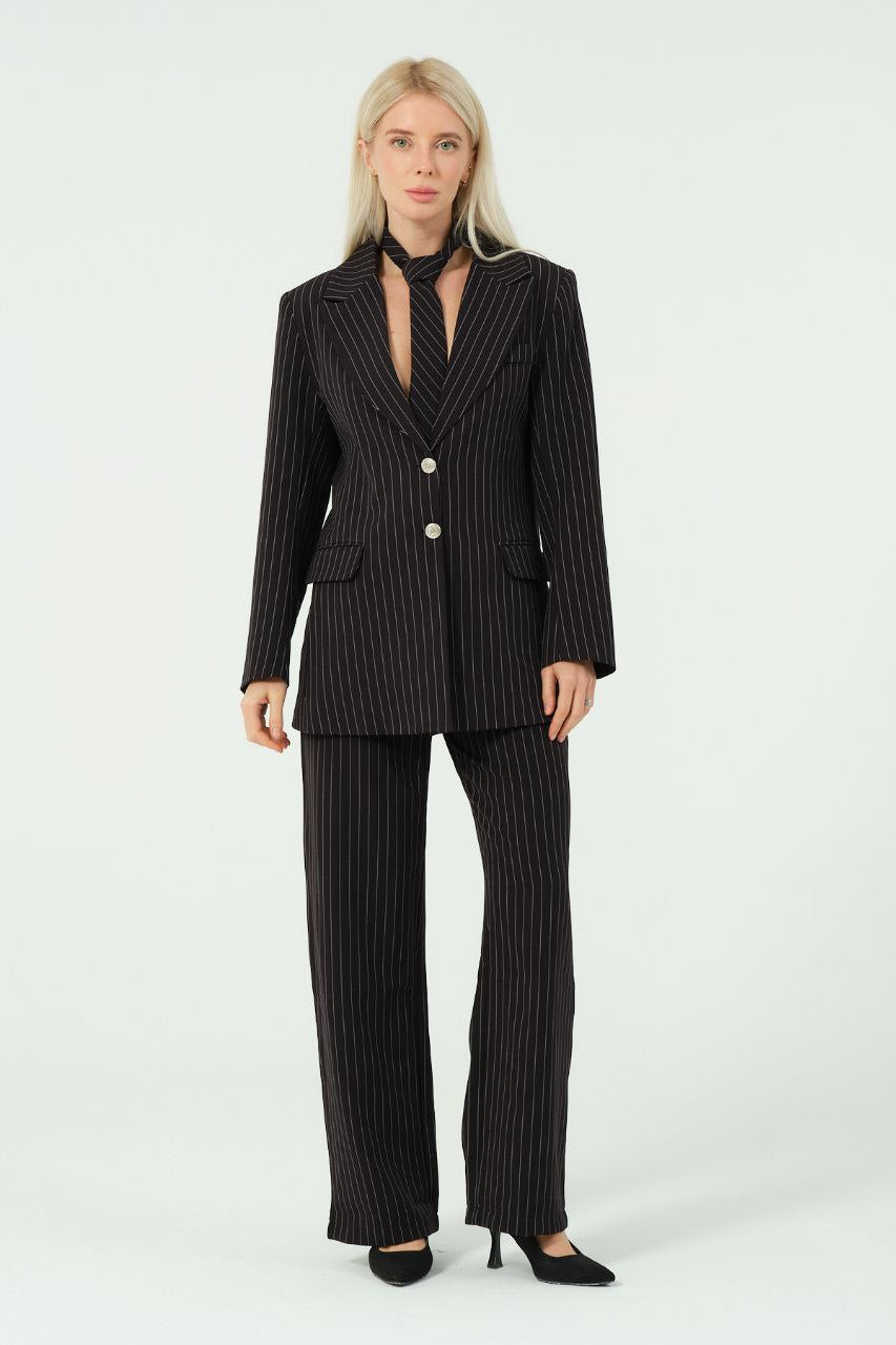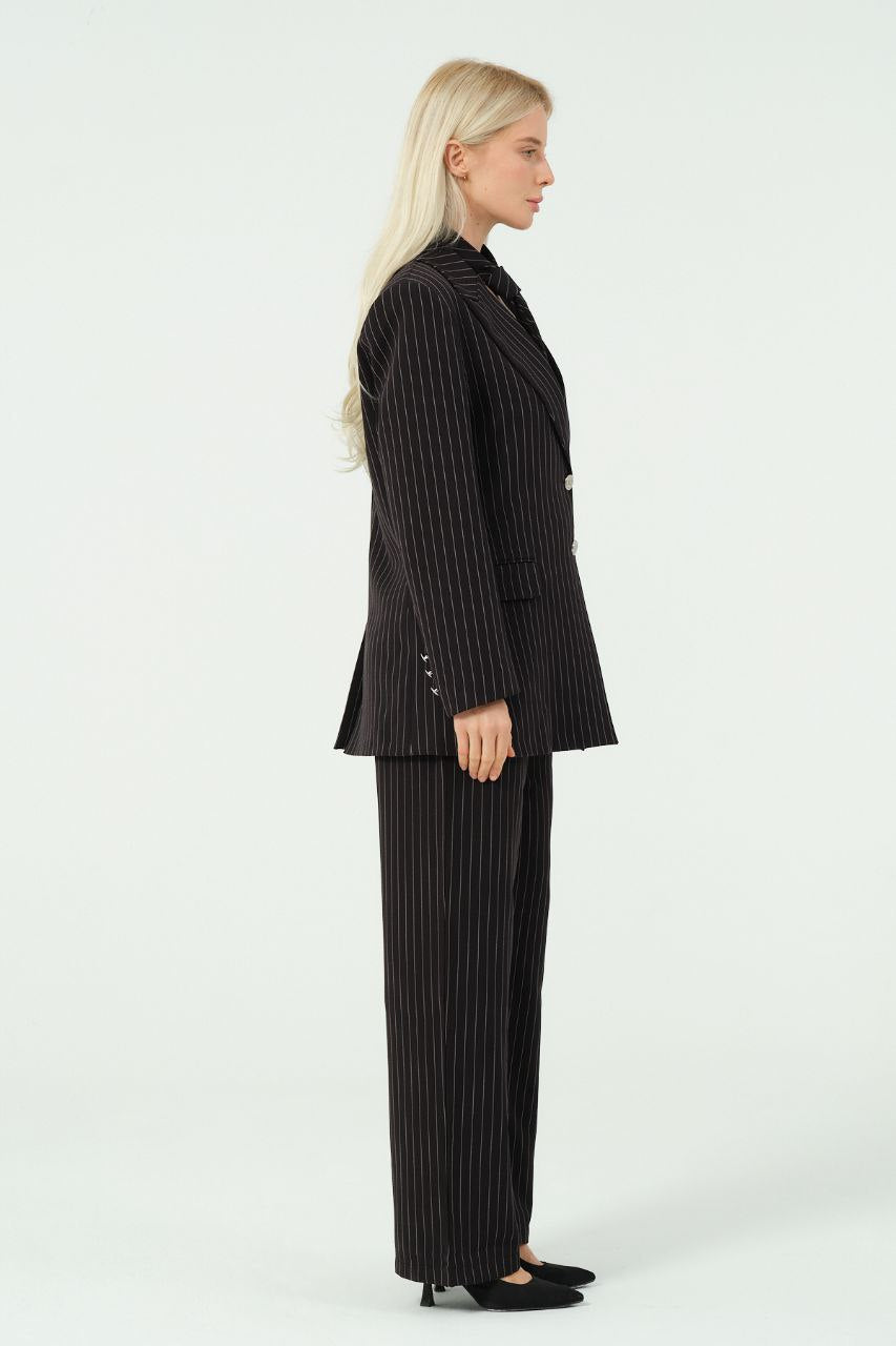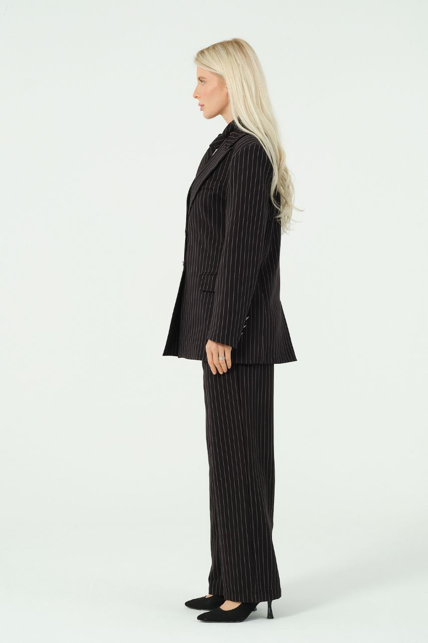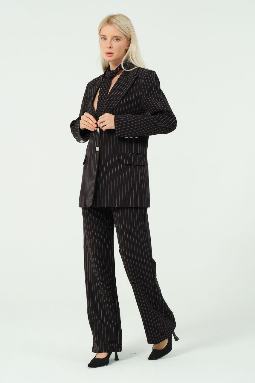 Blazer se odlikuje po strukturiranem kroju z ostrimi reverji, zapiranjem na eno zapenjanje in brezčasnim vzorcem črt.