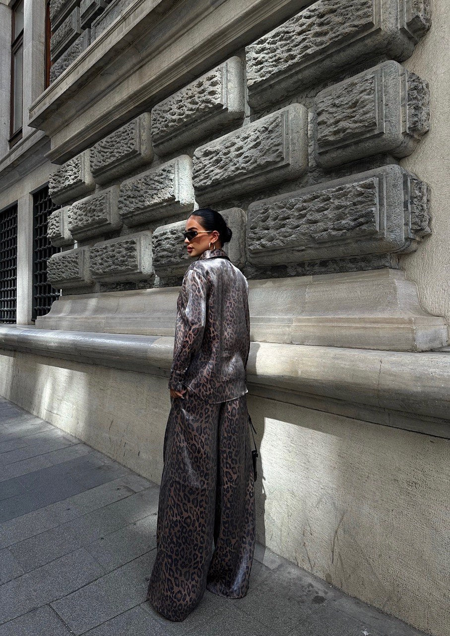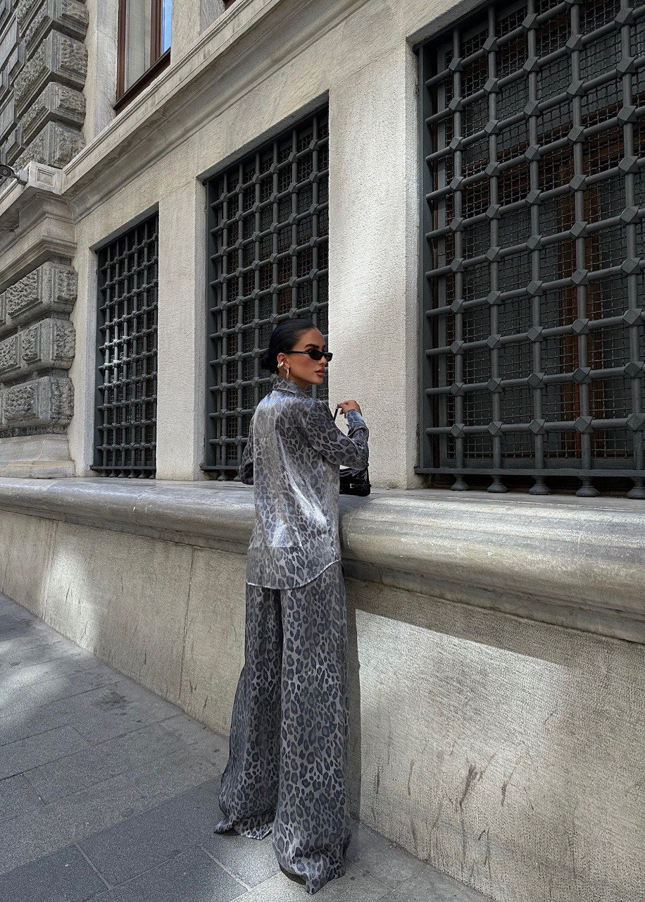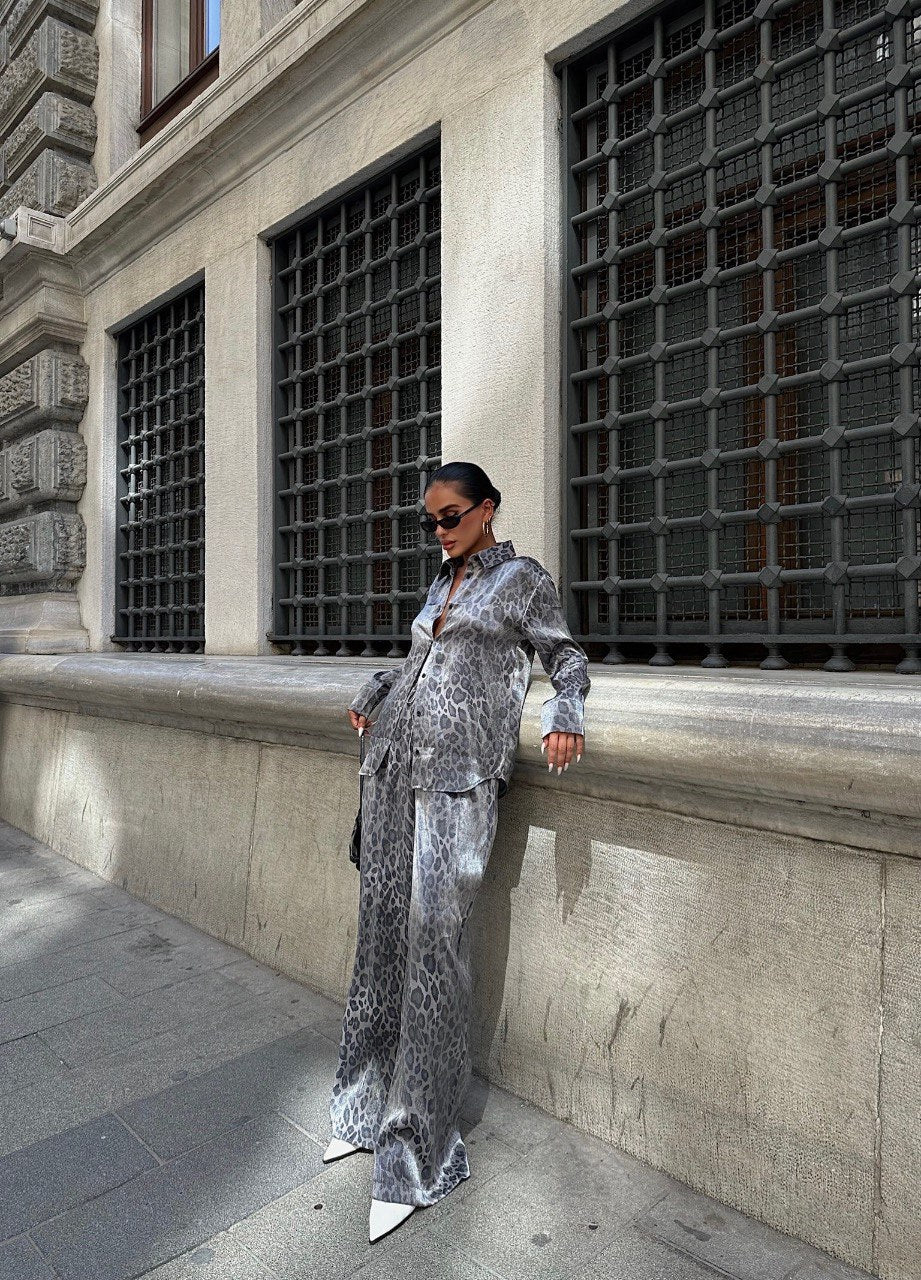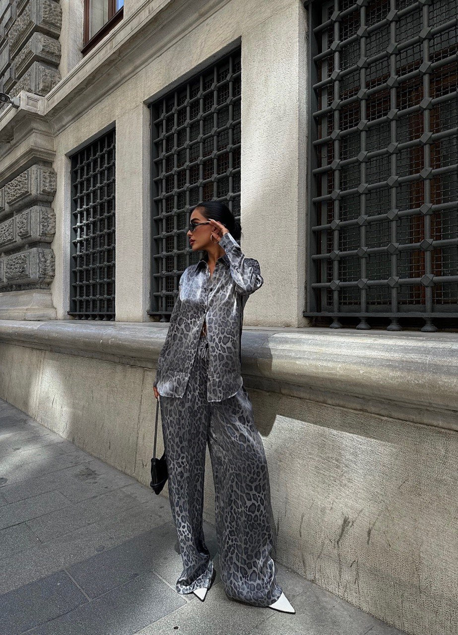 Ujemajoč se satenasti komplet z abstraktnim leopardjim potiskom po celem telesu v monokromatskem sivem odtenku.