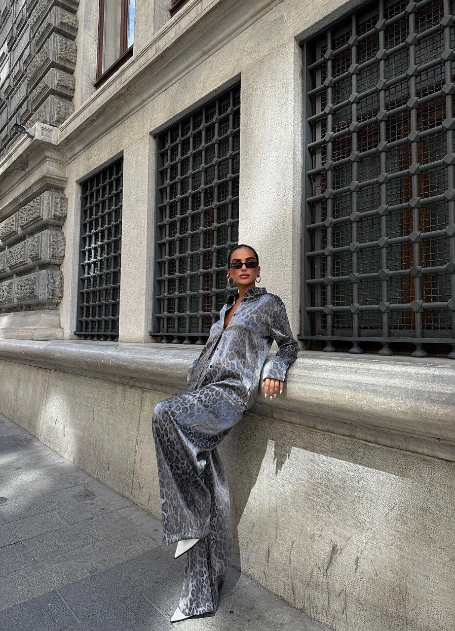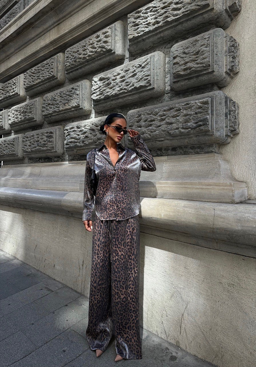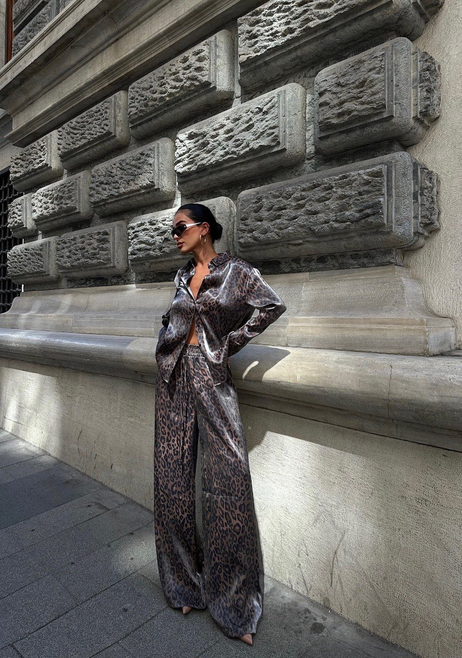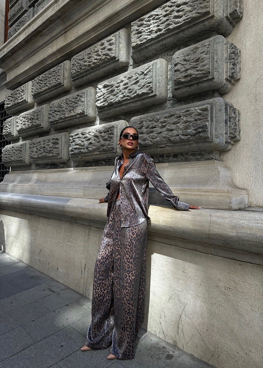 Ujemajoč se satenasti komplet z abstraktnim leopardjim potiskom po celem telesu v monokromatskem sivem odtenku.