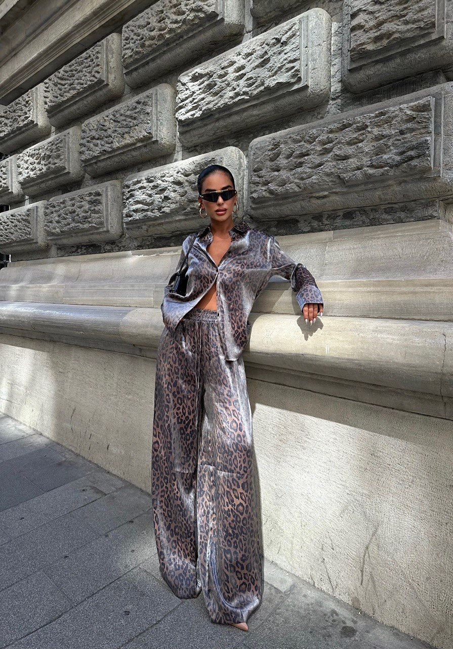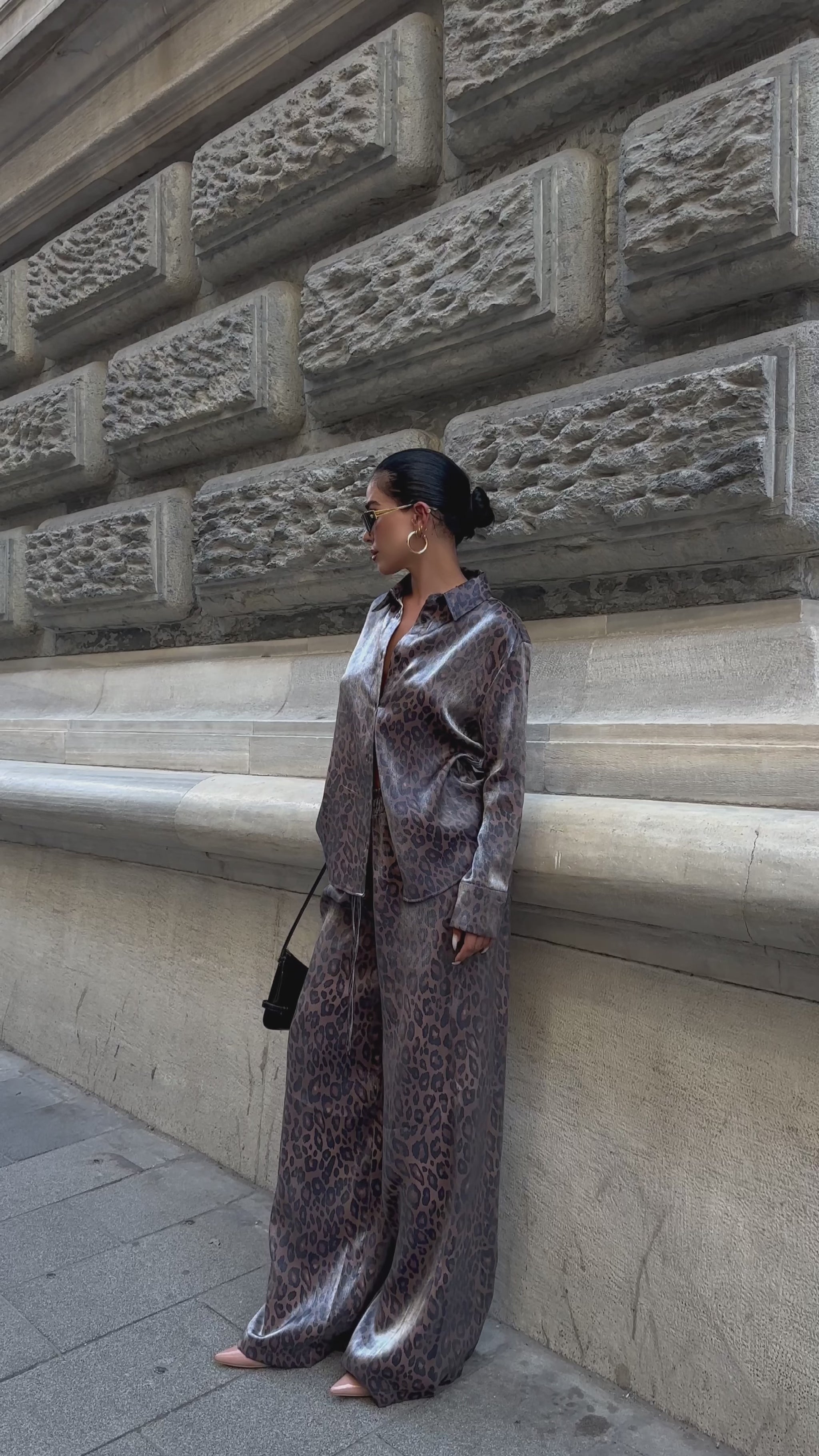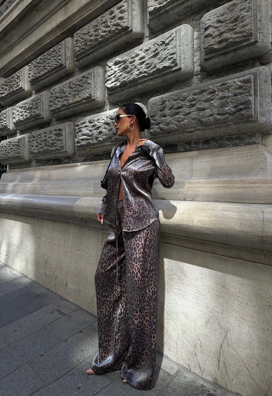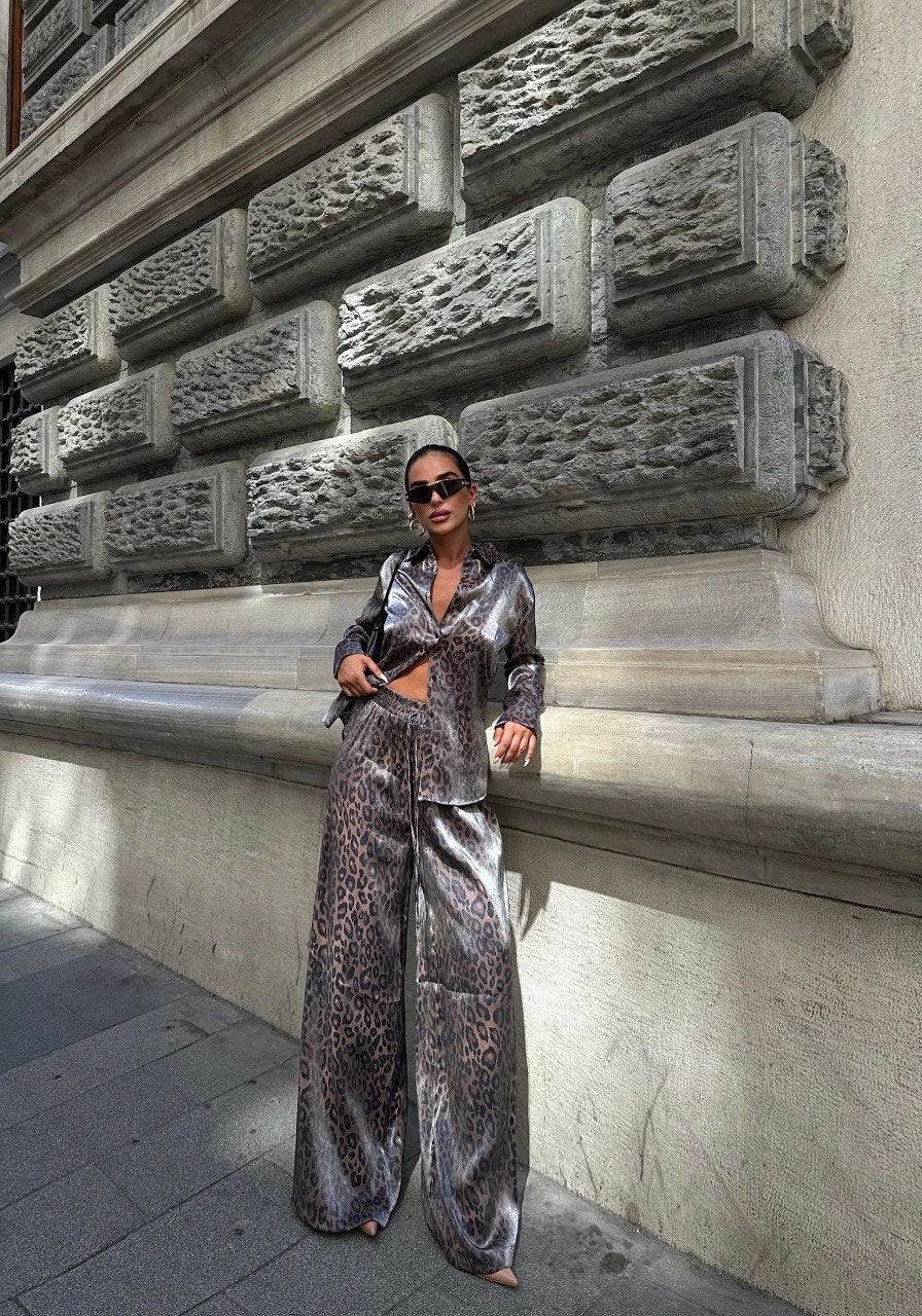 Ujemajoč se satenasti komplet z abstraktnim leopardjim potiskom po celem telesu v monokromatskem sivem odtenku.