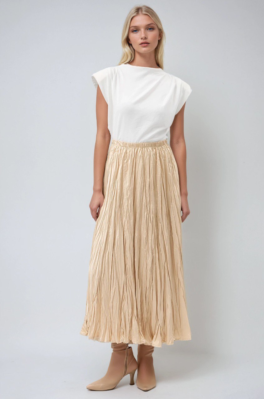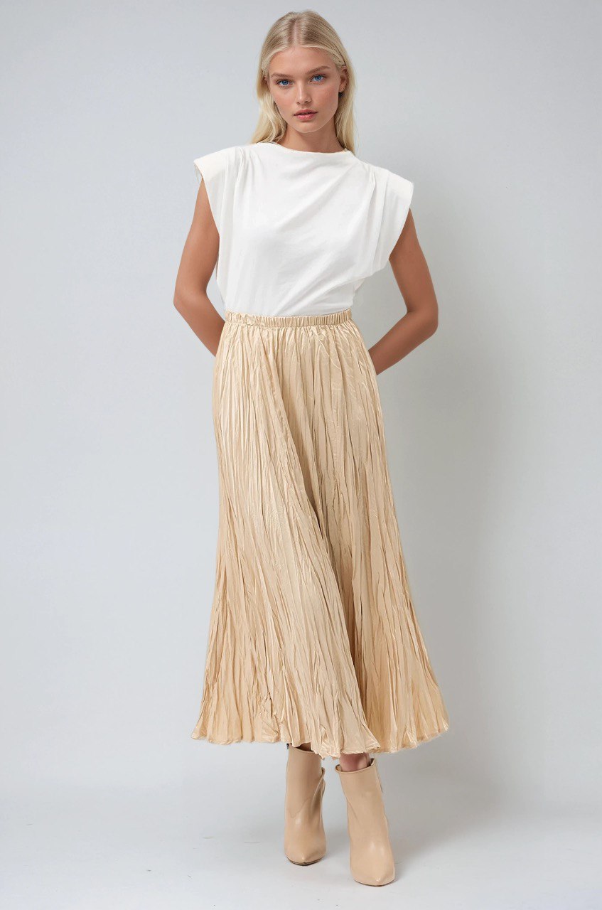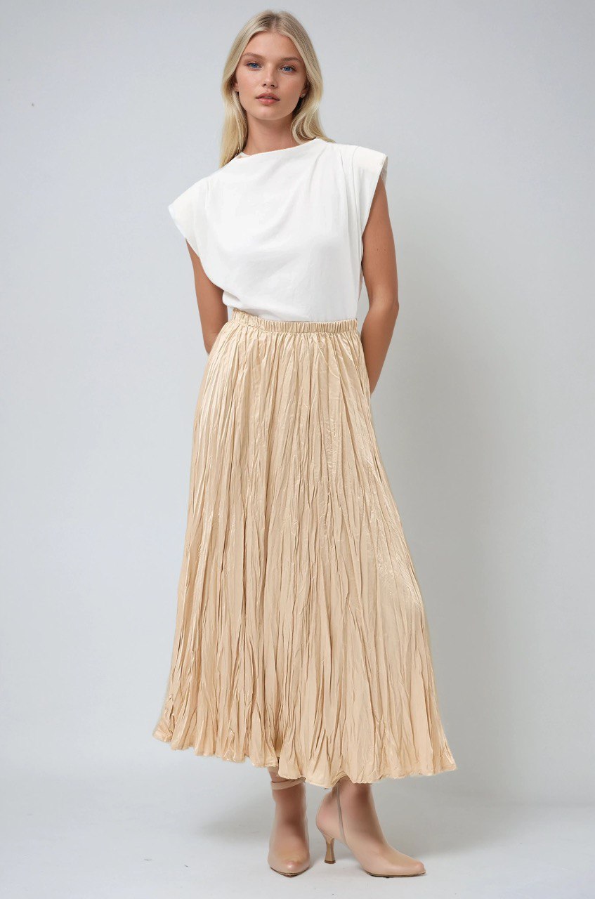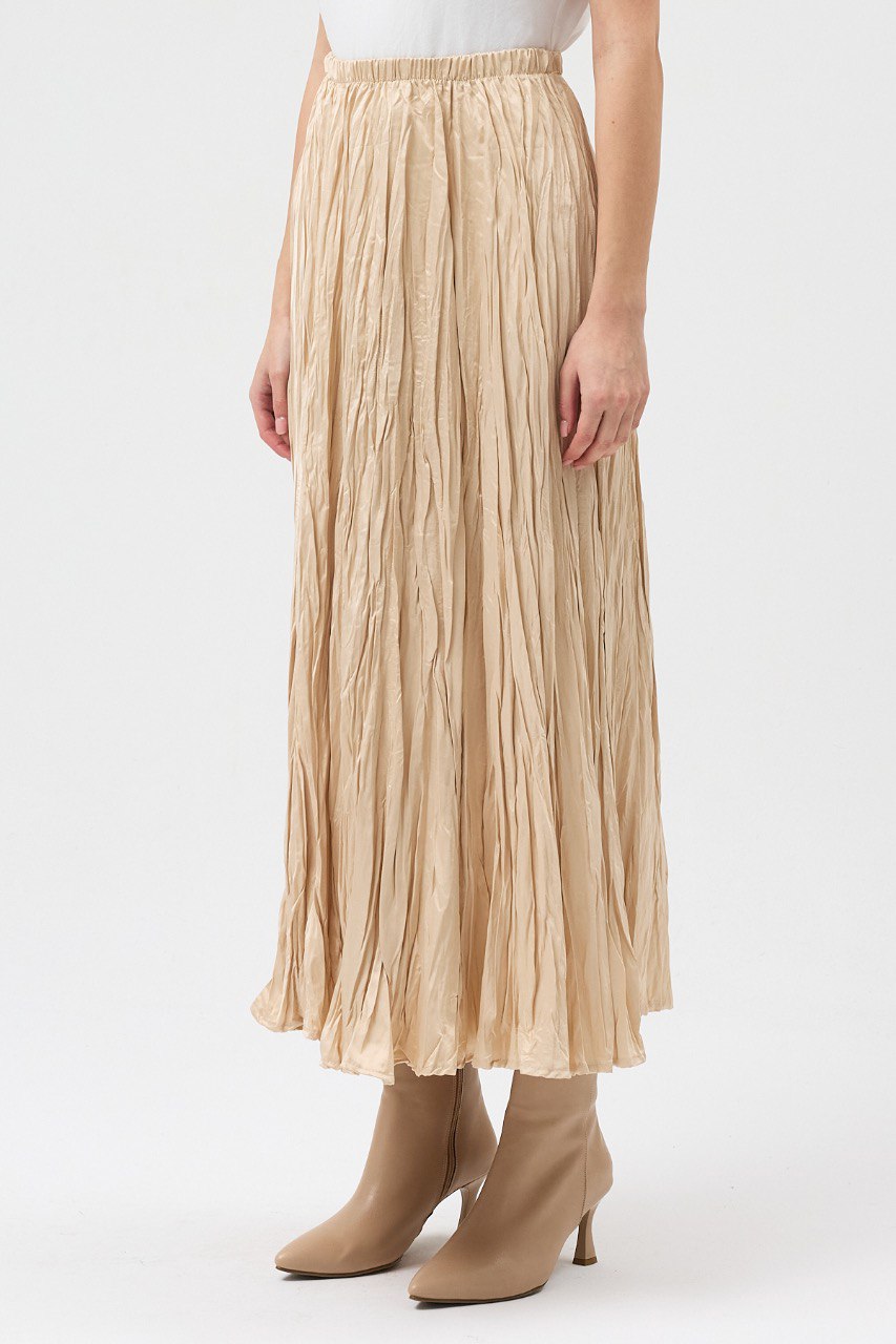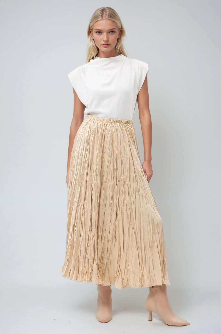 Padajoče, ženstveno in brezskrbno prefinjeno – to nabrano maksi krilo je brezčasen nepogrešljiv kos garderobe. Zasnovano je tako, da se lepo giblje z vsakim korakom, ter vsakemu videzu doda mehkobo in eleganco.