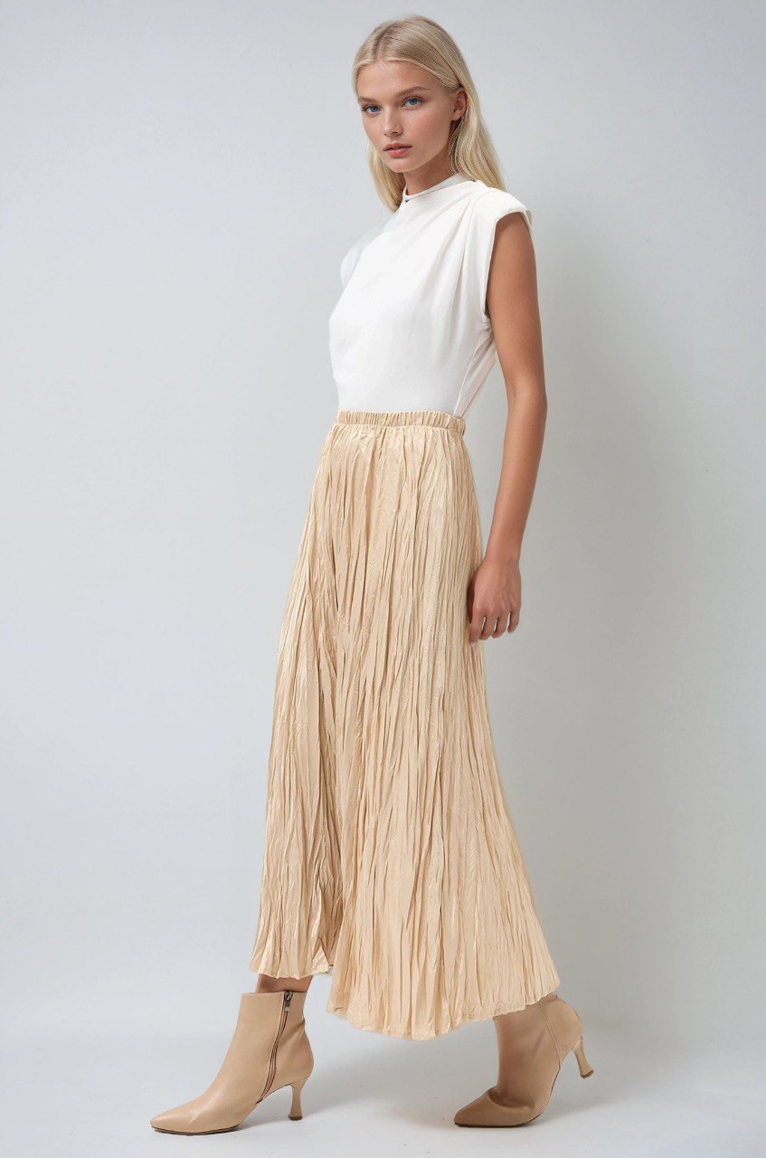 Lahka viskozna tkanina se elegantno spušča in ustvarja tekočo silhueto, ki laska postavi. Elastičen visok pas zagotavlja udobje, hkrati pa poudarja linijo pasu, zaradi česar se zlahka kombinira z oprijetimi zgornjimi deli in sproščenimi pleteninami. Nežna nagubana tekstura doda globino in subtilen pridih, ne da bi pri tem preglasila videz oblačila.