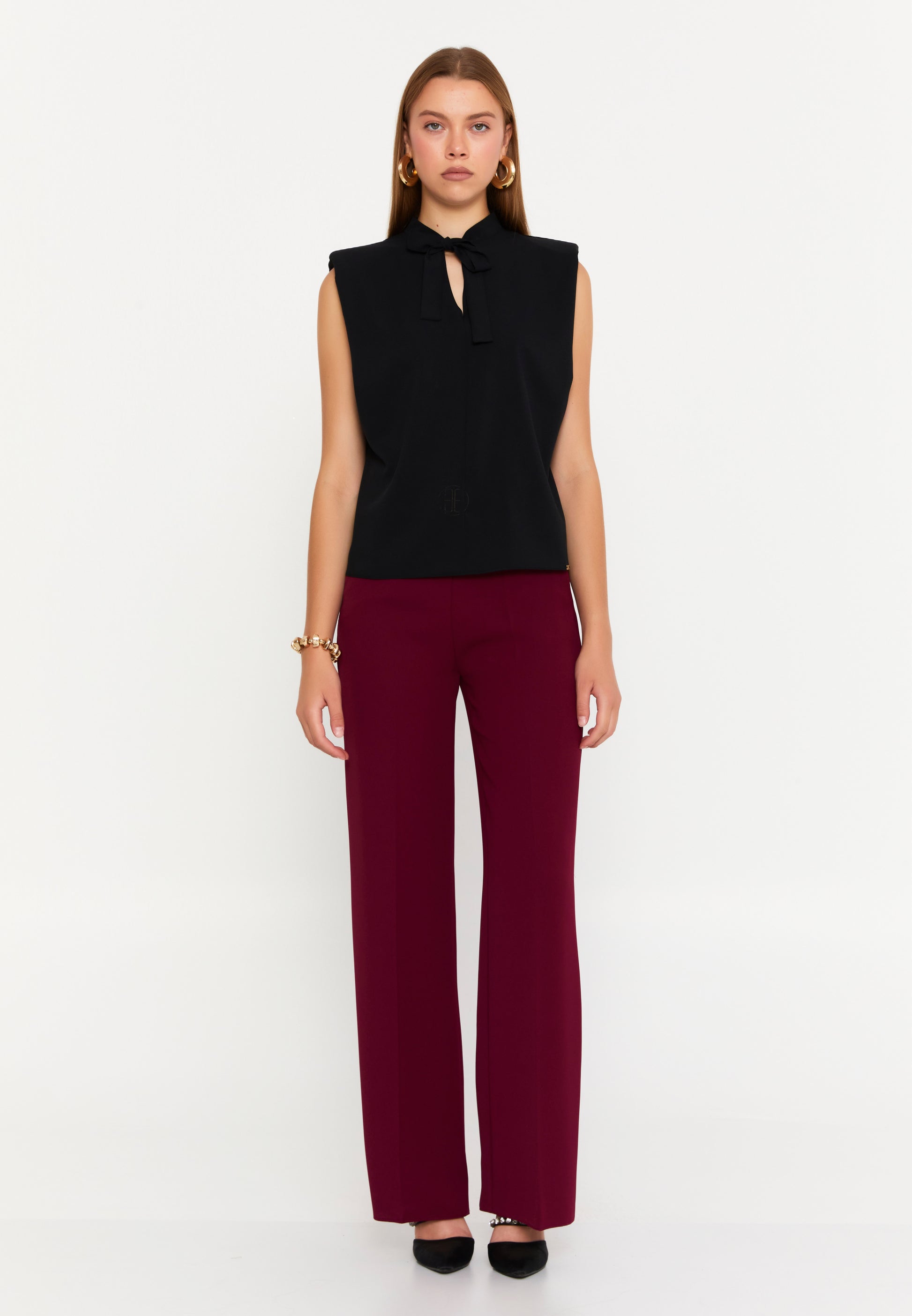 S tem lahkotno elegantnim topom, ki je na voljo v črni in beli barvi, bodite izjemni. Ta model brez rokavov, ukrojen za sodobno žensko, ima na izrezu ženstveno pentljo, ki ji doda eleganten pridih šarma. Top, izdelan iz visokokakovostnega poliestra, ponuja udobje in zračnost, zaradi česar je idealna izbira tako za sproščene kot formalne priložnosti. Sproščen kroj dopolnjujejo široke bordo hlače, ki ustvarjajo uravnoteženo in prefinjeno silhueto.