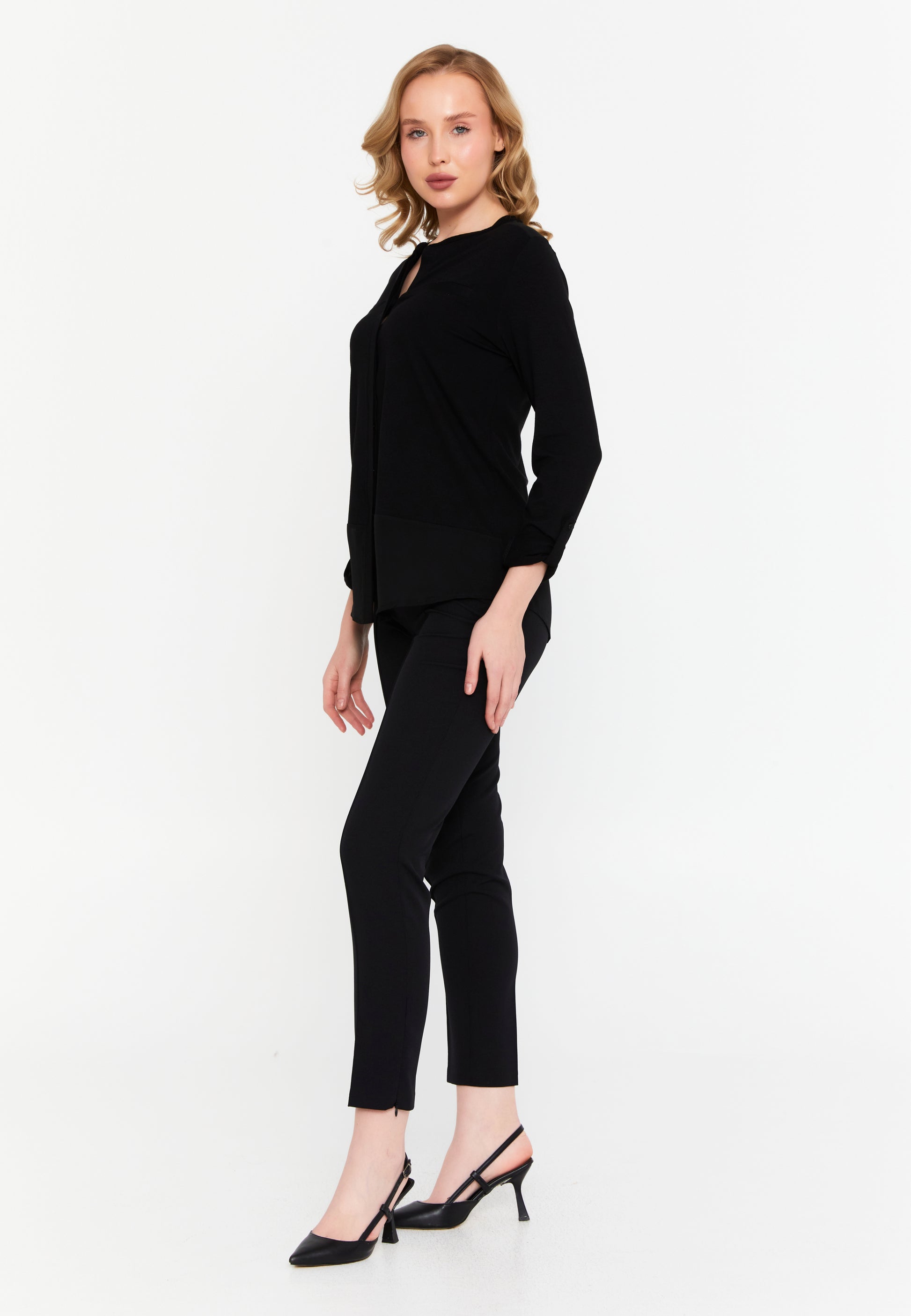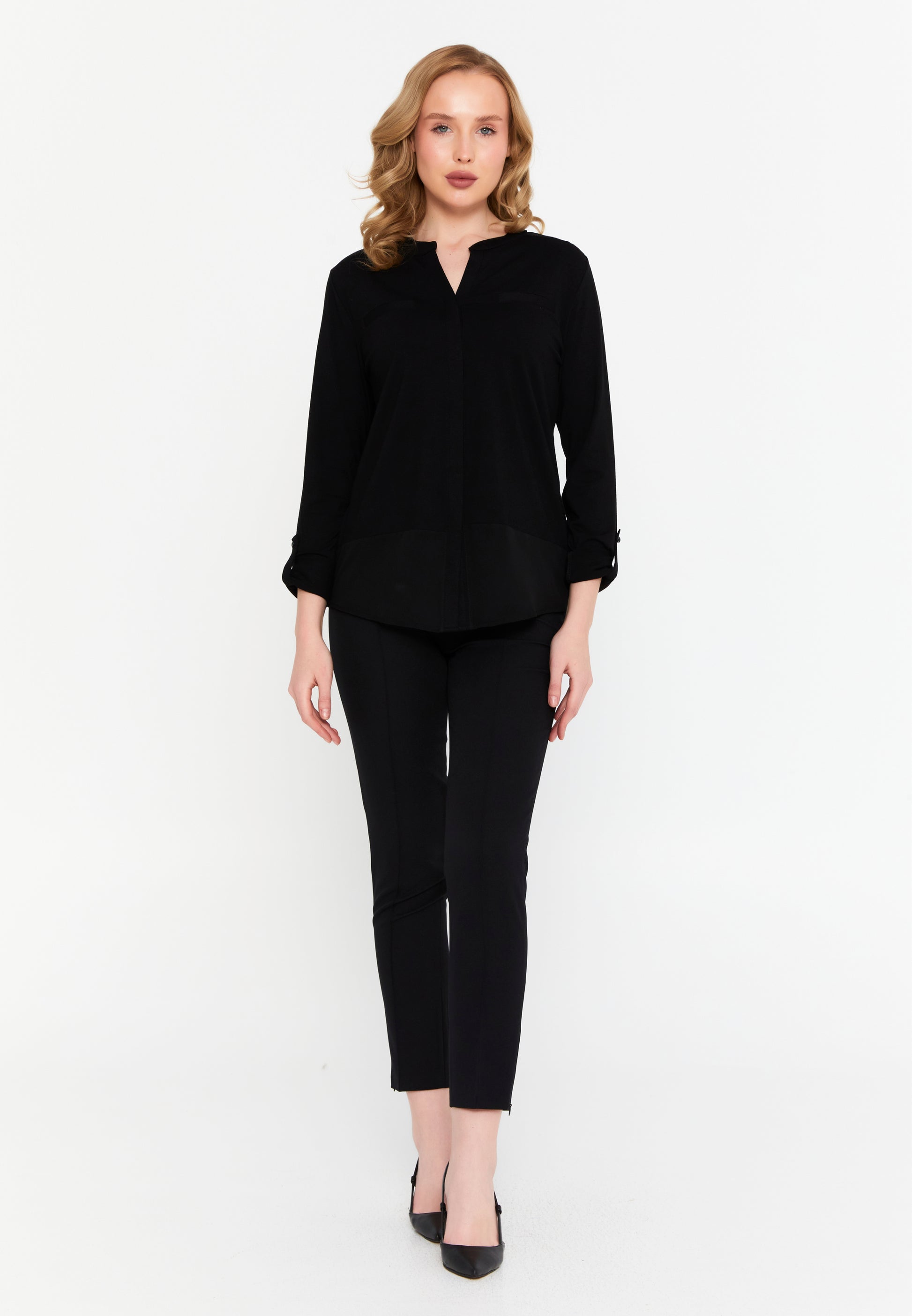 S to brezčasno črno bluzo, zasnovano za lahkoten stil in udobje, bodite elegantni. Njena laskava silhueta in subtilni detajli, vključno z zavihanimi rokavi z manšetnimi poudarki, zagotavljajo popolno mešanico sproščene prefinjenosti. Ta zgornji del, izdelan iz razkošne mešanice viskoze, poliestra in elastana, zagotavlja mehko in prilagodljivo prileganje, idealno za celodnevno nošenje. Ne glede na to, ali se oblačite za dan v pisarni ali se odpravljate na sproščen večer, bo ta vsestranski kos zagotovo dopolnil vašo garderobo.